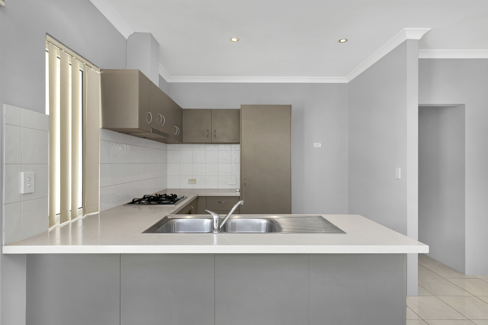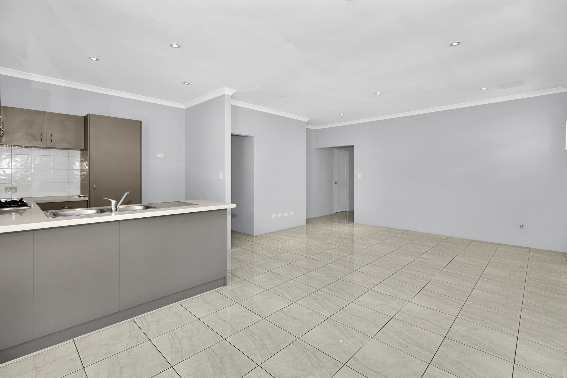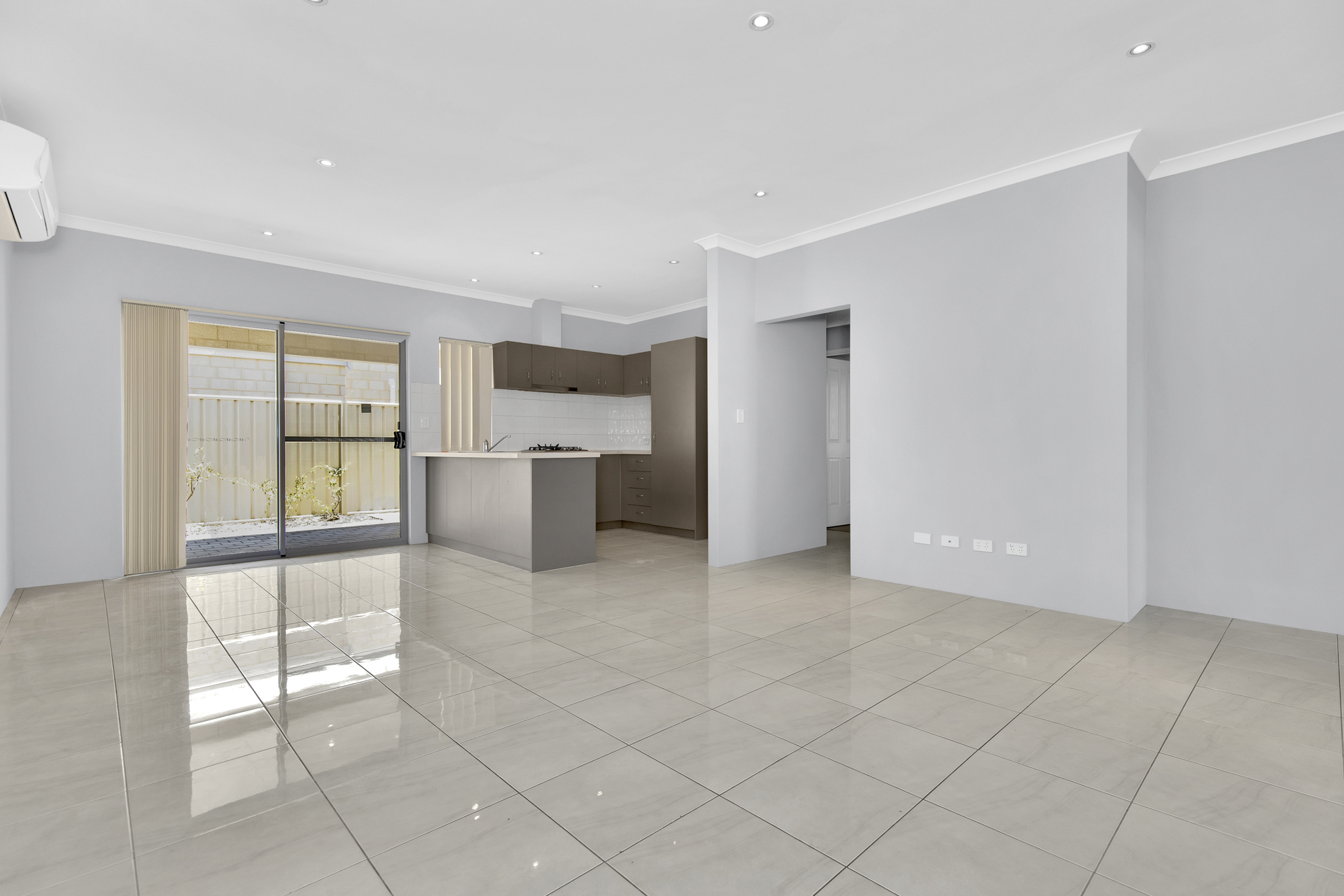 Neat and clean tiled living room with Aircon with open kitchen fitted with 4 hob gas cooktops, dishwasher, fridge recess and plenty of storage cupboards.