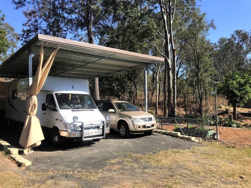 * 2 Bay brick and tile shed with attached double carport (may have options for man-cave or dual living opportunities) + another high double awning for caravans/motor-home storage, (3.5m high)