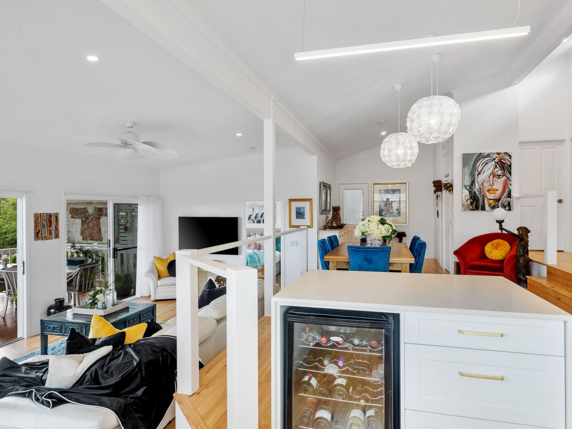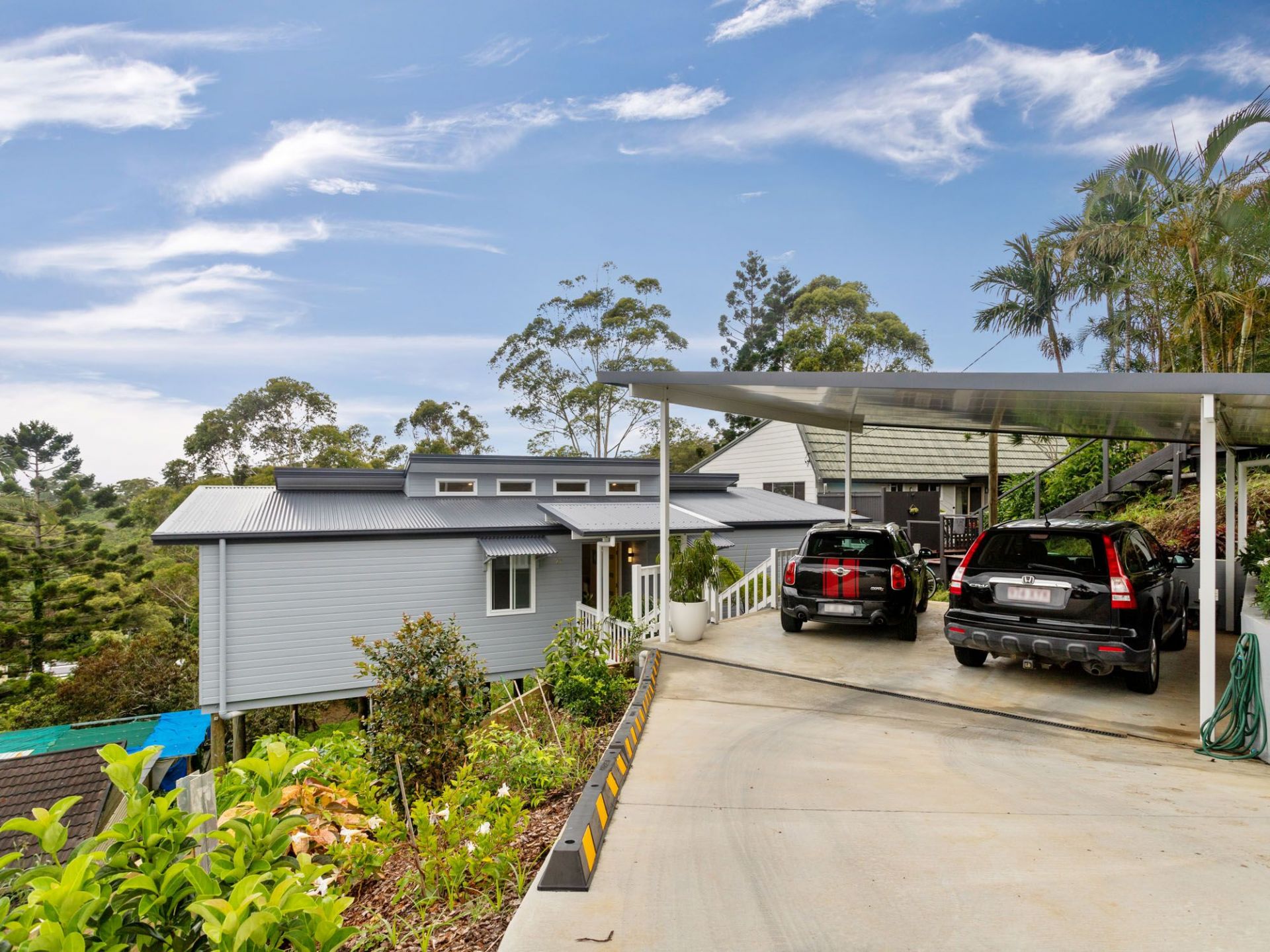Breezy pole home open plan set high on a hill with water glimpses.
