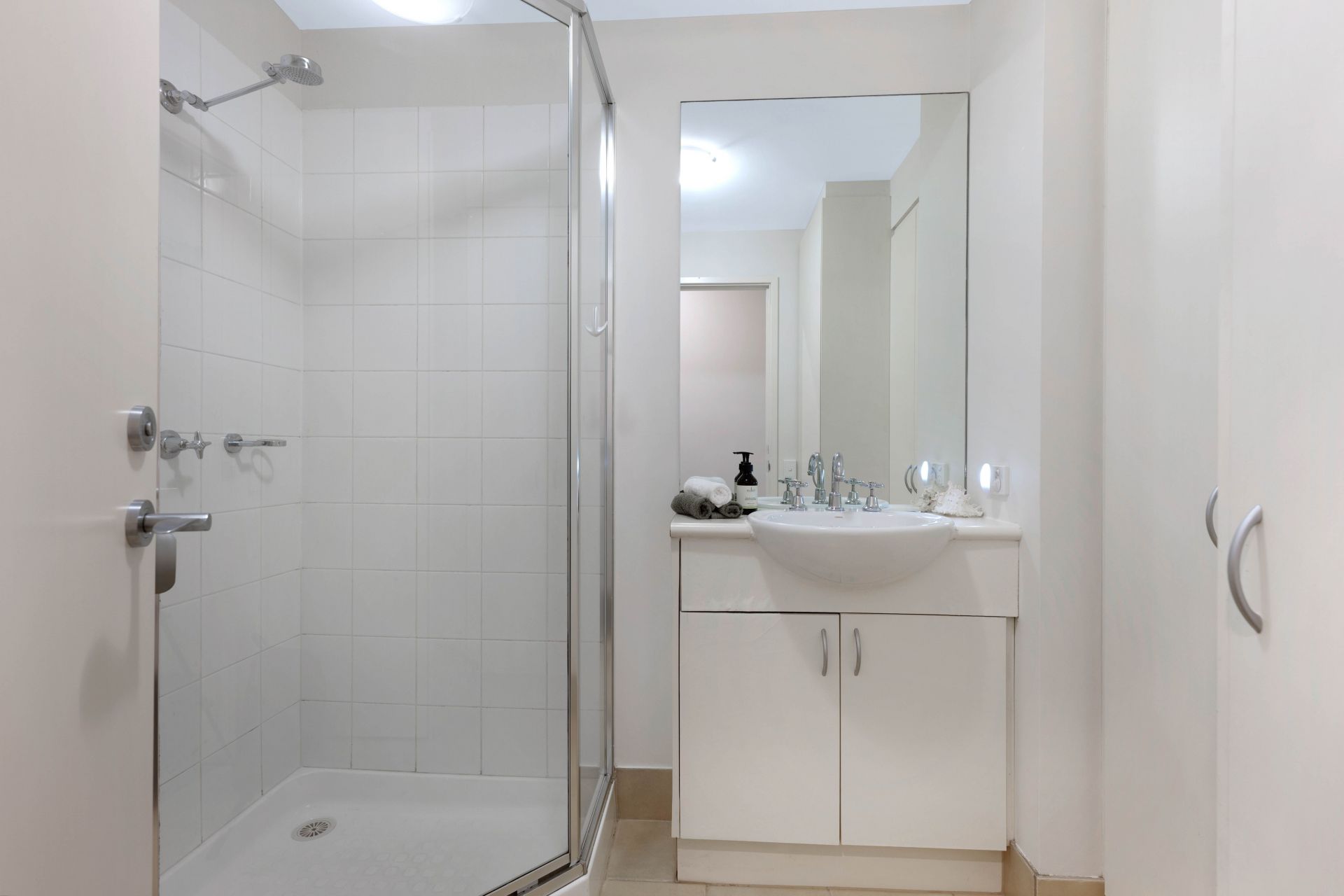 Bathroom includes storage cupboards, toilet, shower and a two-door vanity unit with hand basin