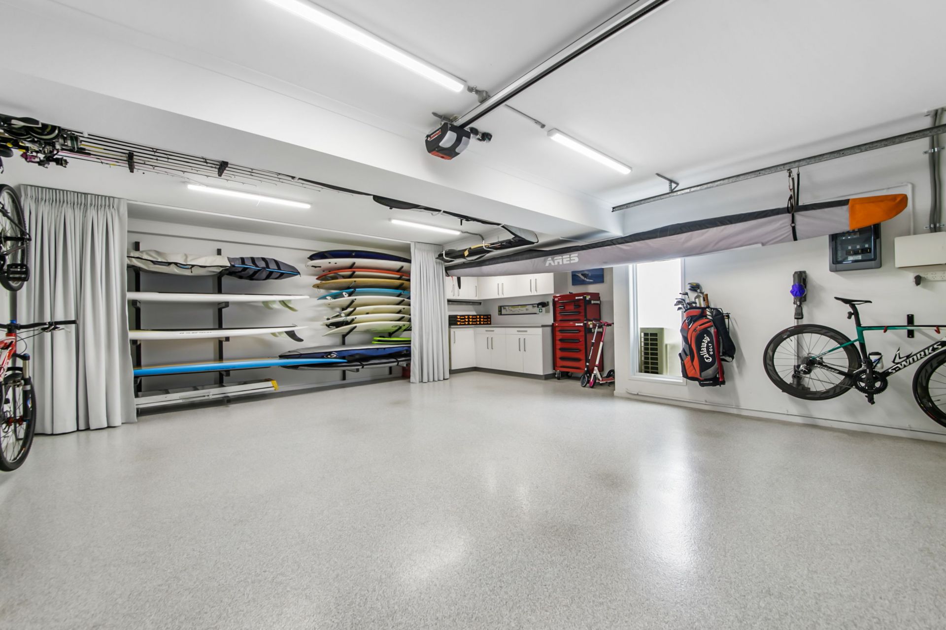 - Ceramic tiled driveway leads to extra large double garage with additional work area that features custom cabinetry and loads of storage. This garage will fit 2 x large 4WD's plus plenty of space for bikes and water craft. Space for a third car within the gated property.