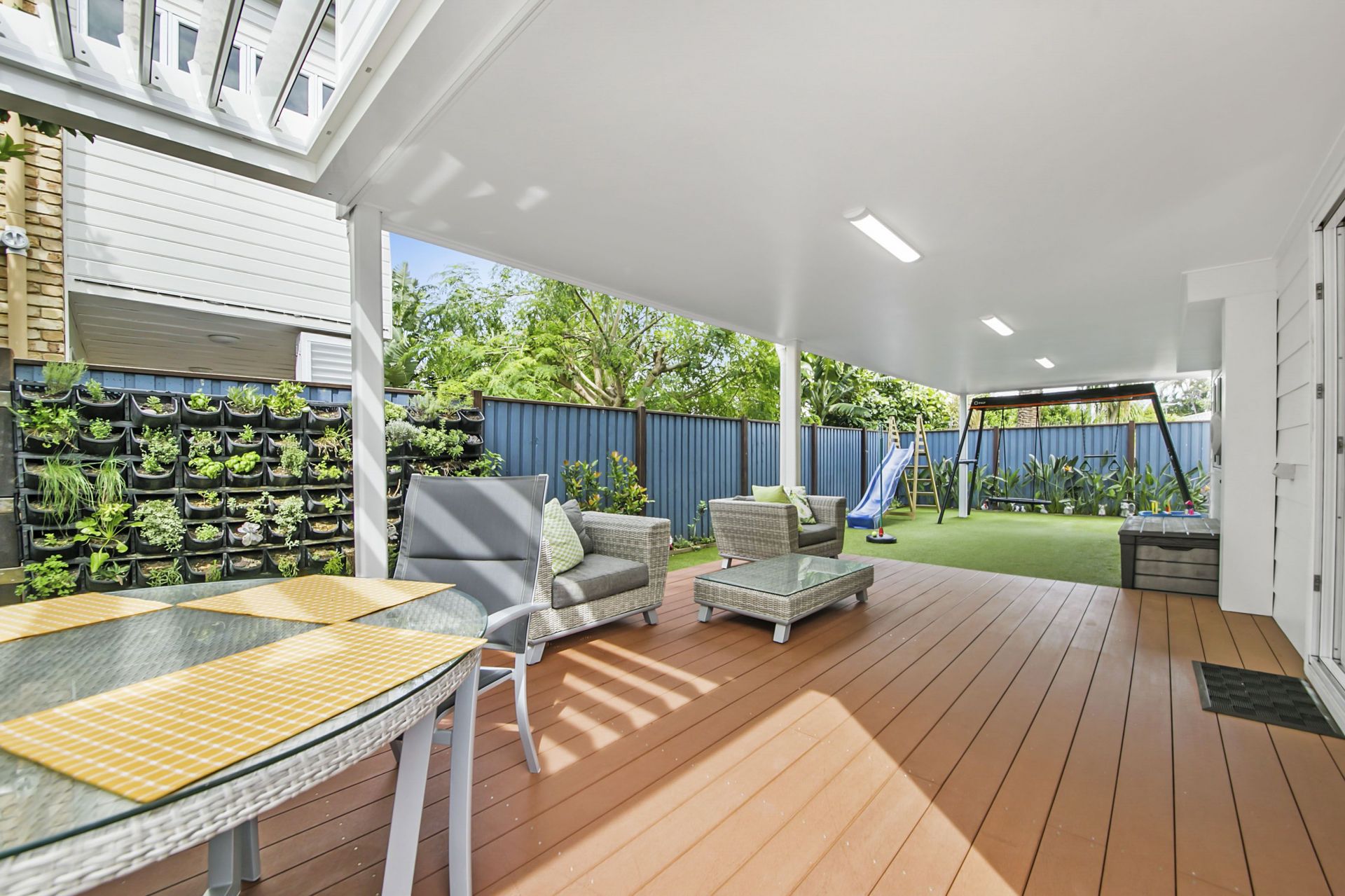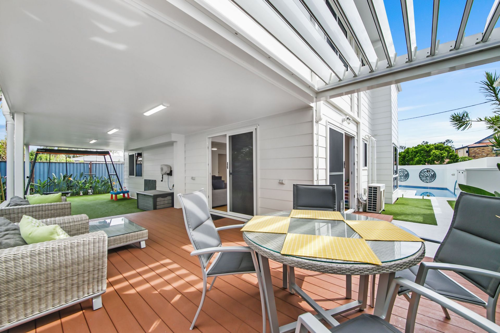 - Rear covered entertaining area flows into pool area and features Gibus opening gazebo and LED lighting. Artificial turf guarantees no maintenance