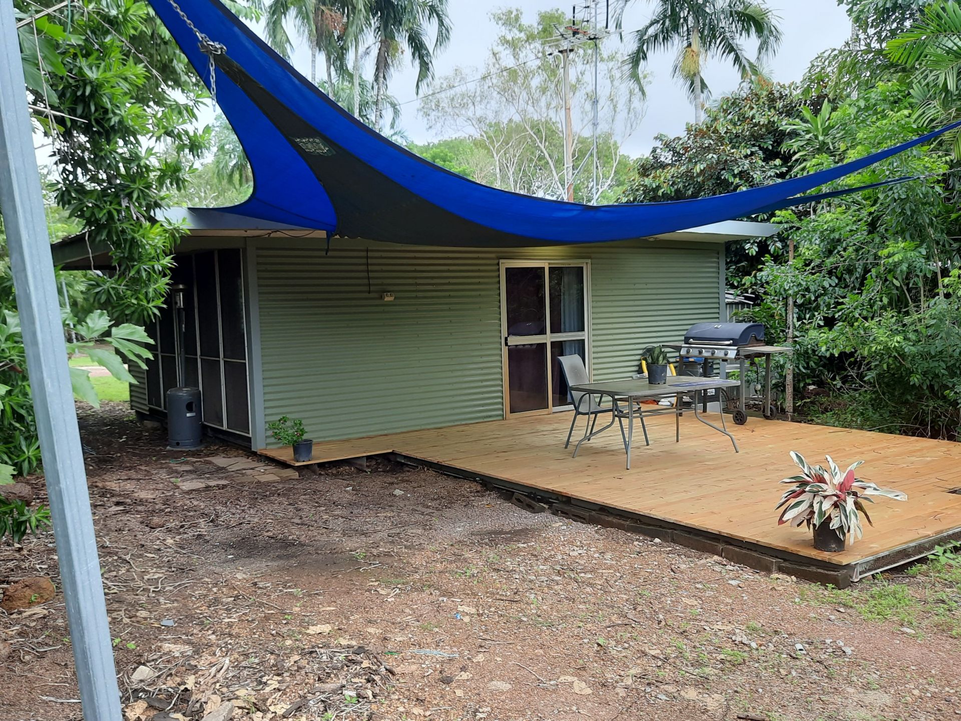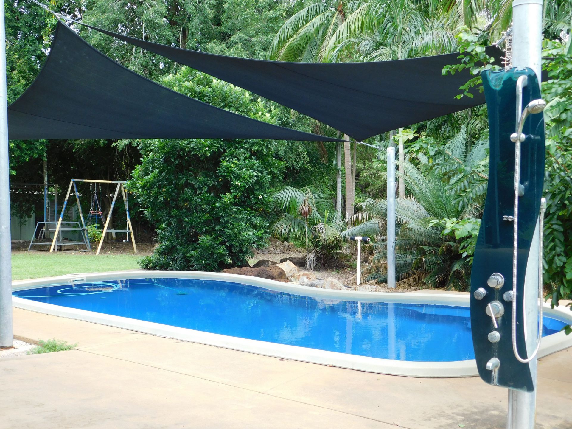 A seperate caravan site is set amongst the tropical palms and established trees hovering under giant twin shade sails, serviced by its own water, TV aerial and access to power. Ideal for when the family from down south come to visit.