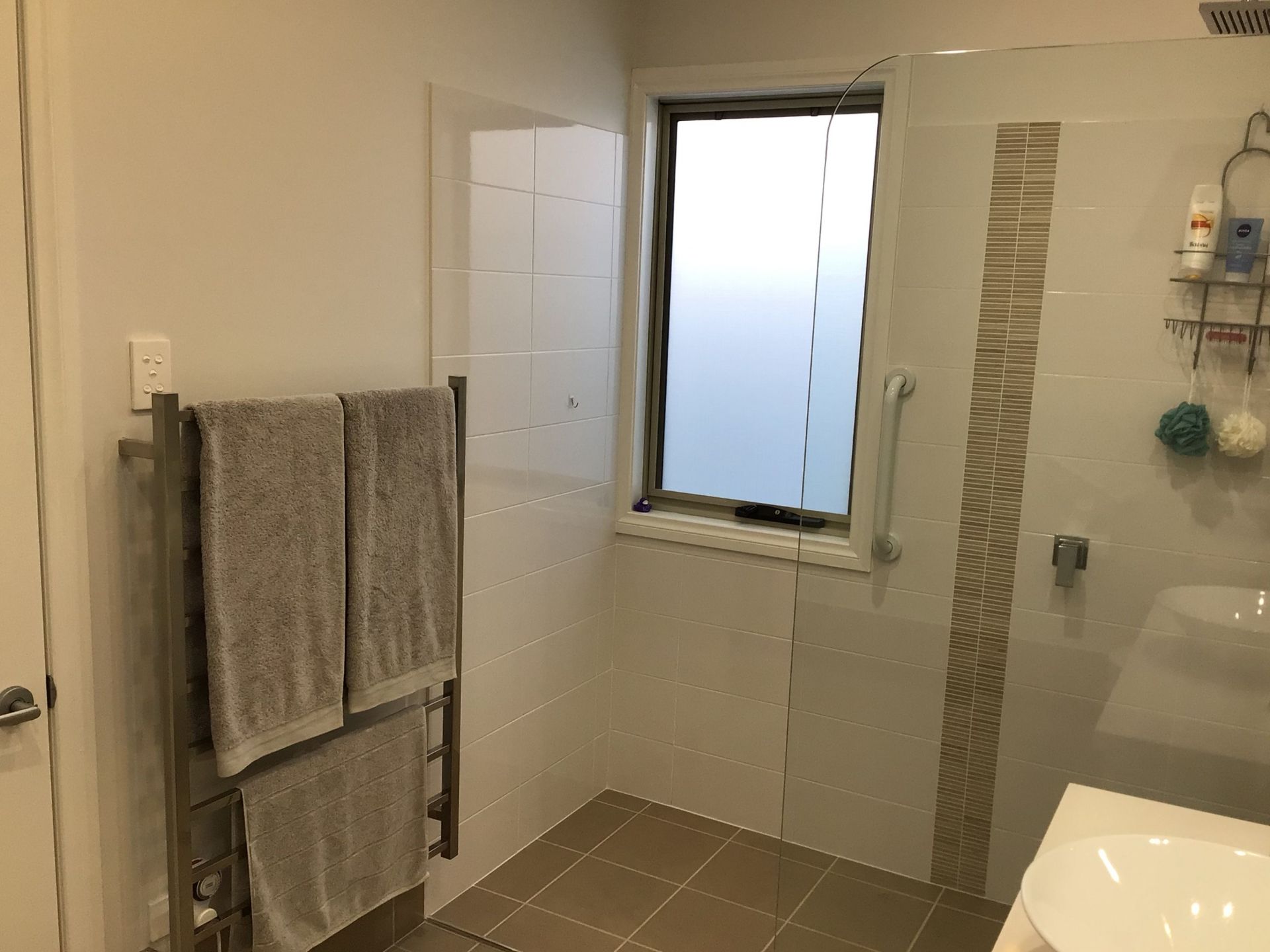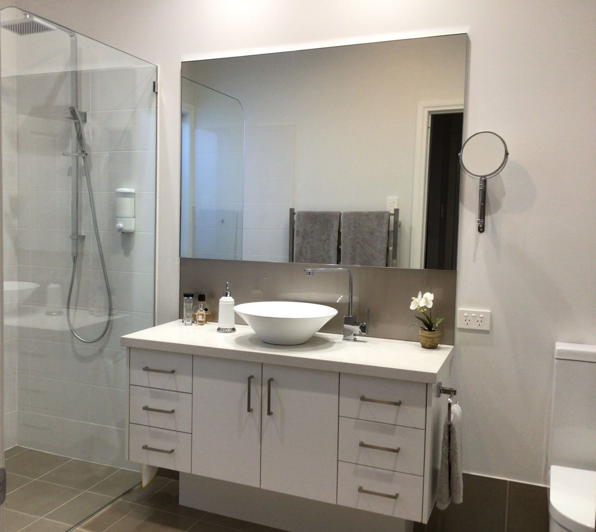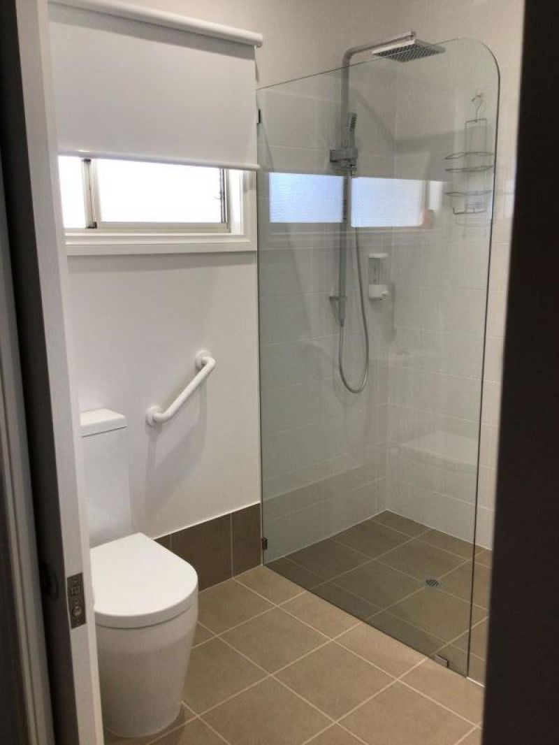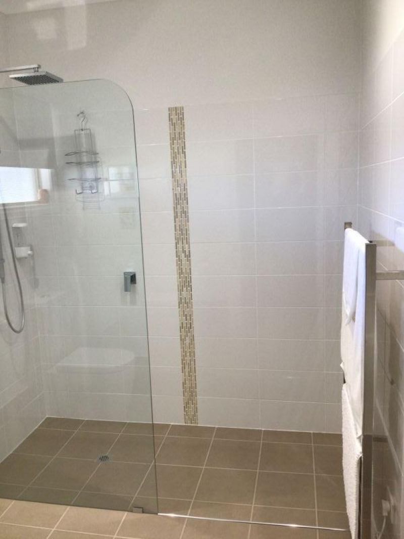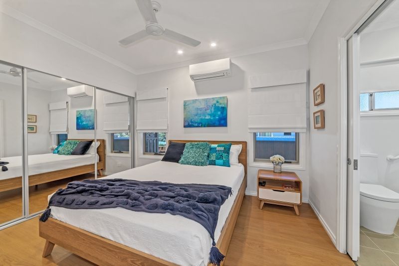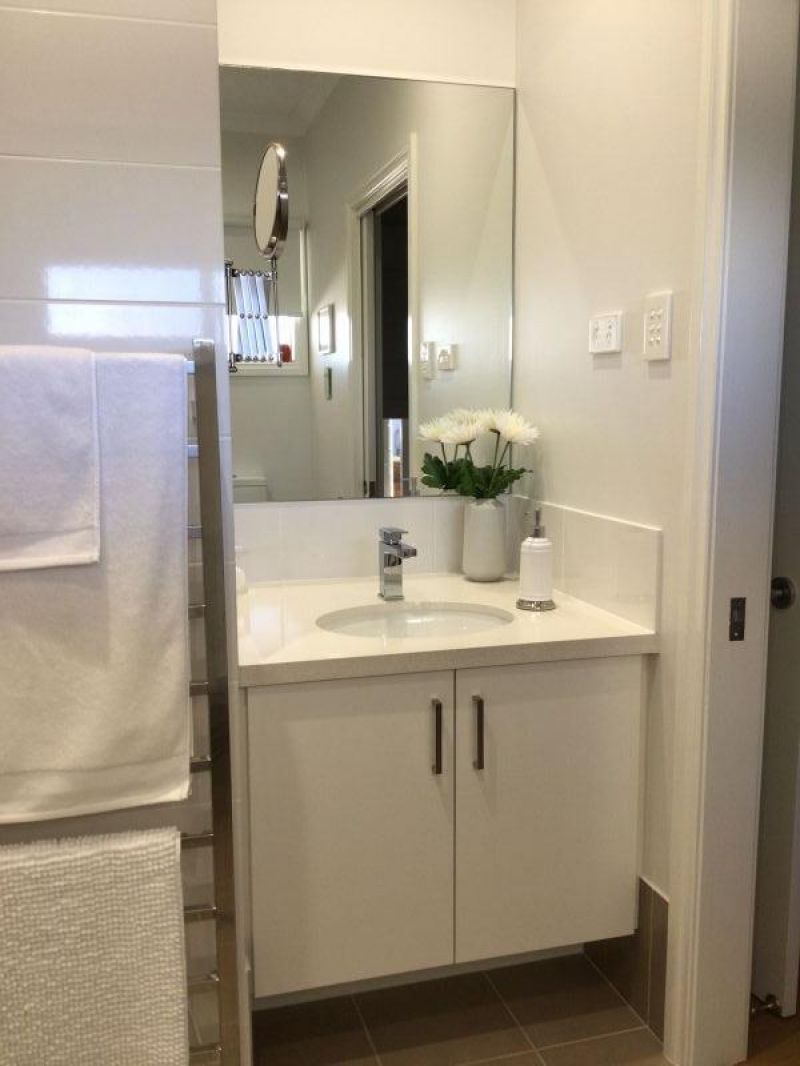 The guest bedroom has a ceiling sweep fan, reverse cycle air conditioner, built in robes with sliding mirrored doors. The ensuite is complete with heated towel rail, vanity basin, hobless shower, toilet and a 4 heat/fan/light.