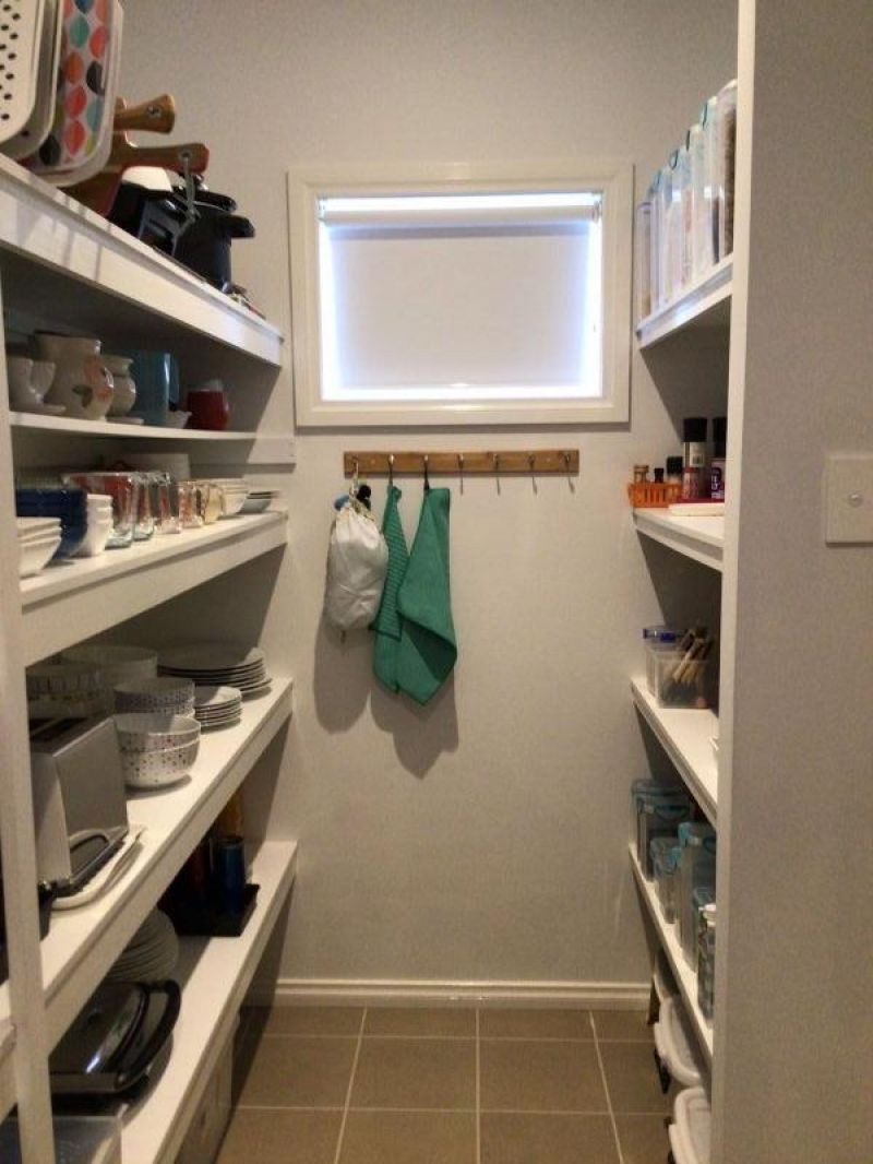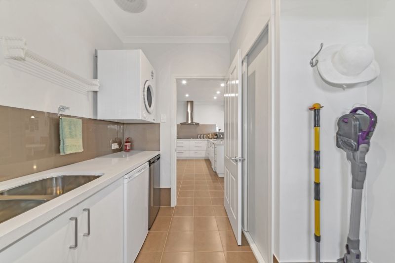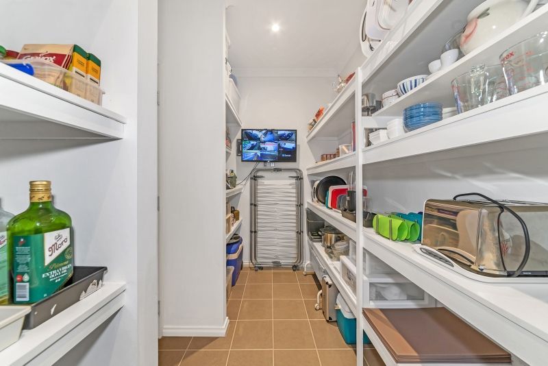 The modern kitchen includes Caesarstone bench tops, glass splashbacks, soft closing drawers, induction hot plate, oven stack, water filter, dishwasher, fridge recess and a huge walk-in pantry.