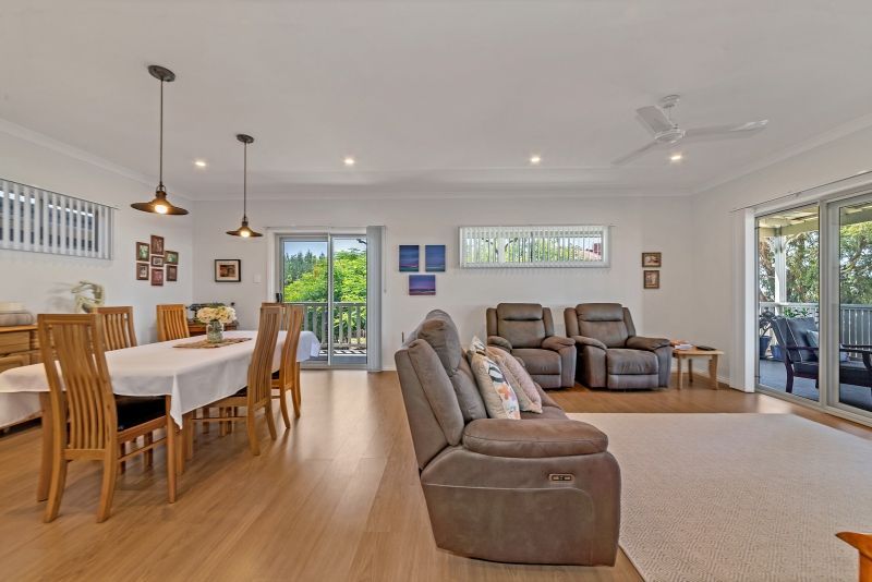 The home's living areas consist of a spacious open plan kitchen, dining and family area. This leads out onto an entertaining deck with glimpses of the estuary.