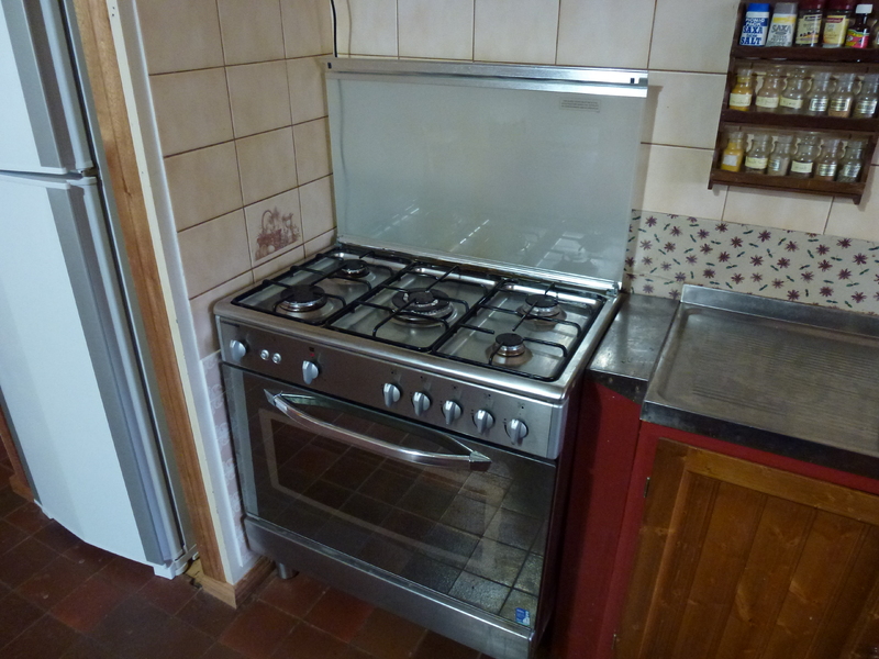 The spacious kitchen and dining room, separated from the lounge by a feature stone wall, includes a modern low energy fridge, a gas fire and a 900mm freestanding Italian stainless steel gas stove