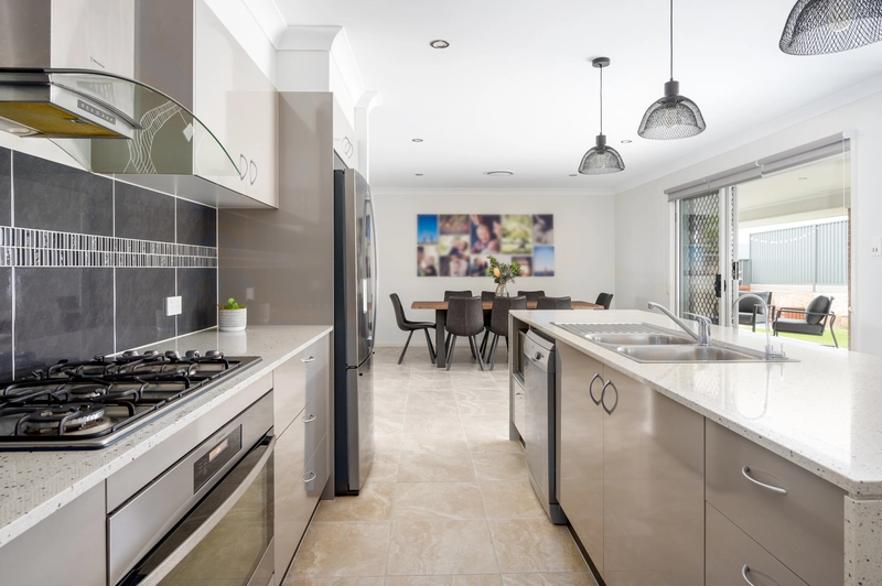 The show stopping gourmet kitchen boasts glossy stone bench tops, a gas cook top, designer tap wear, walk in pantry and ample storage.