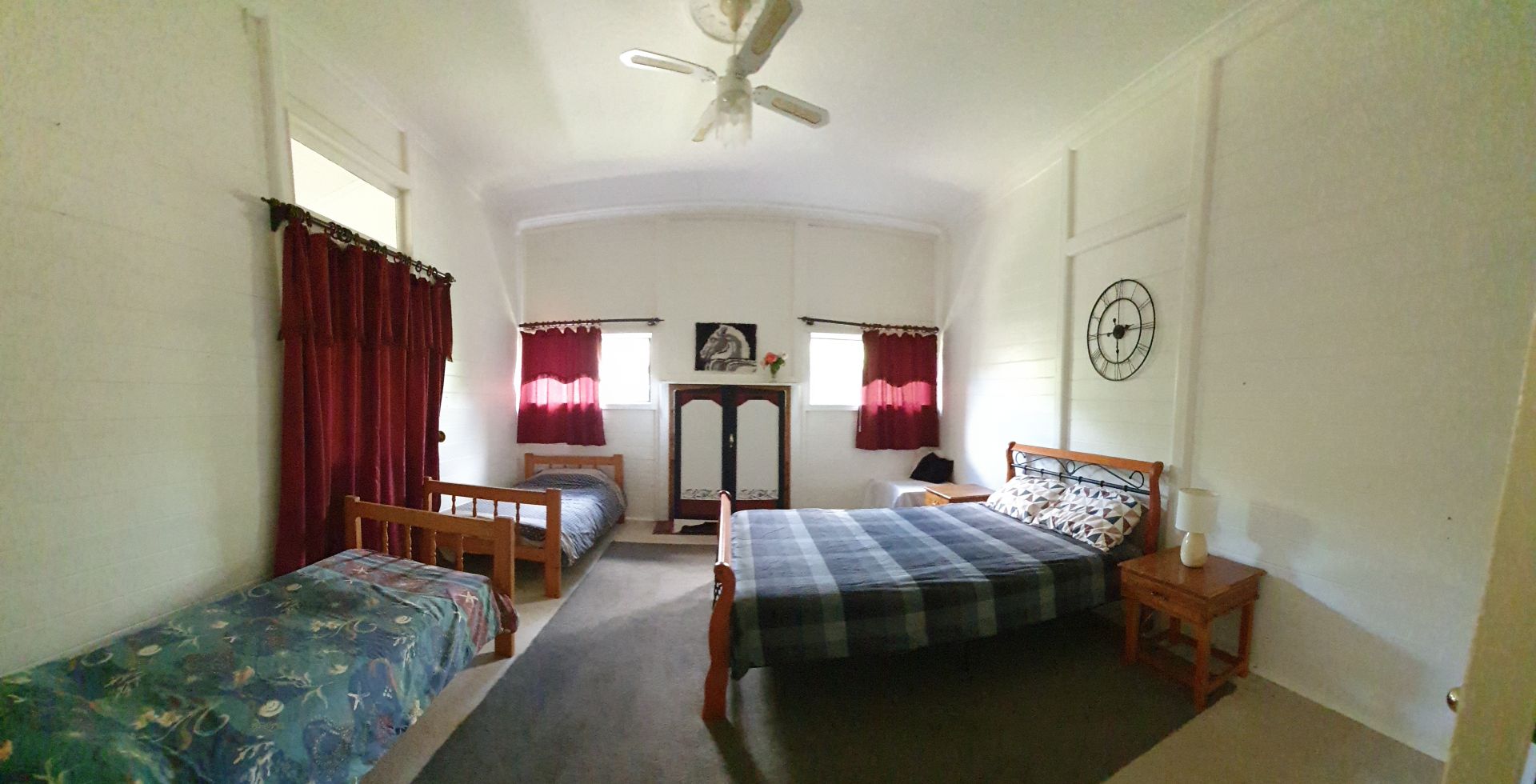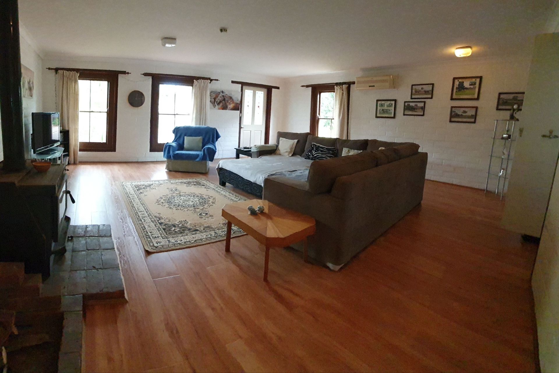 Ceiling fans in the rooms plus air-conditioning for the really hot days and a Big wood fire to warm the house on those winter nights.