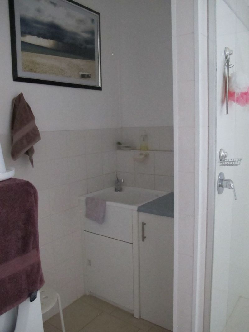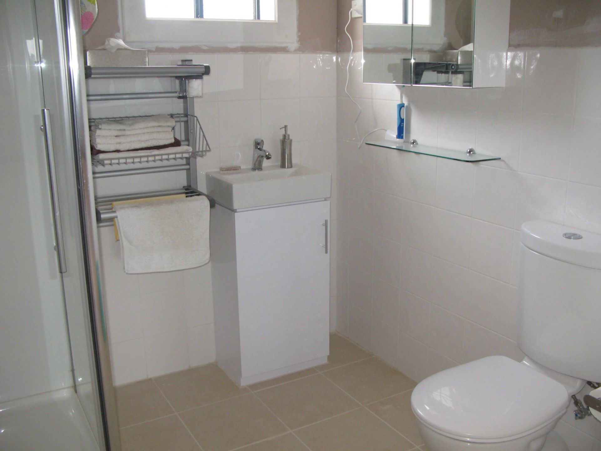 Upstairs and downstairs bathrooms, showers, toilets; upstairs shower is huge, fibreglass waterproofing, fully tiled, two spray heads.
