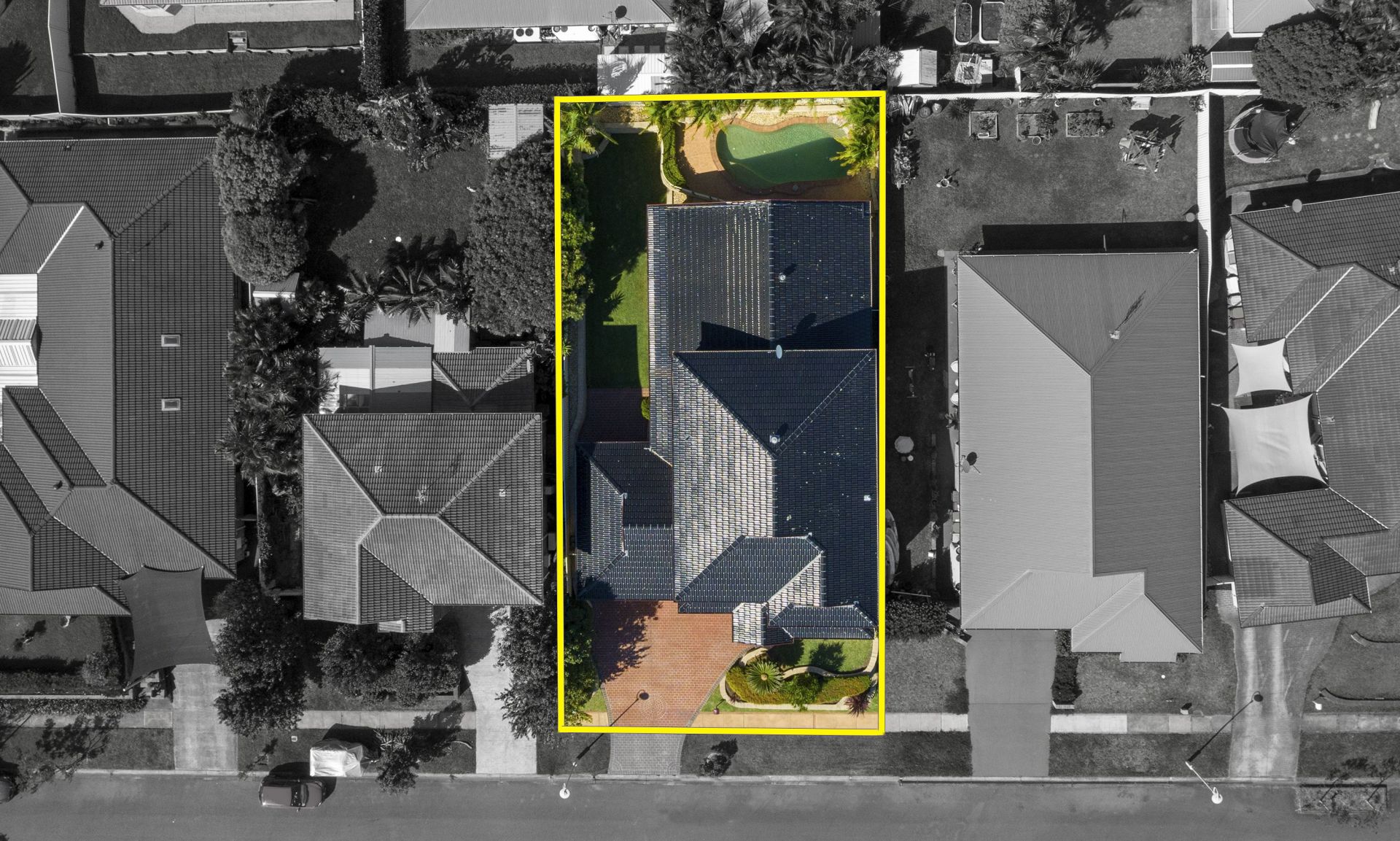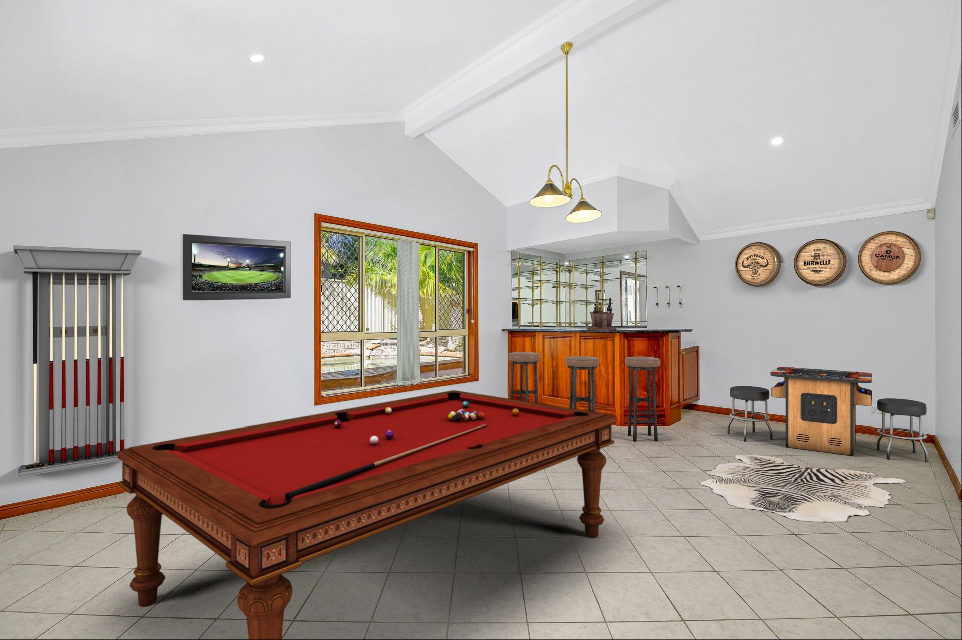 Flow through to the large cathedrial ceiling rumpus room with Timber Blackwood bar to match kitchen. Have a drink by the bar while over looking the heated inground swimming pool.