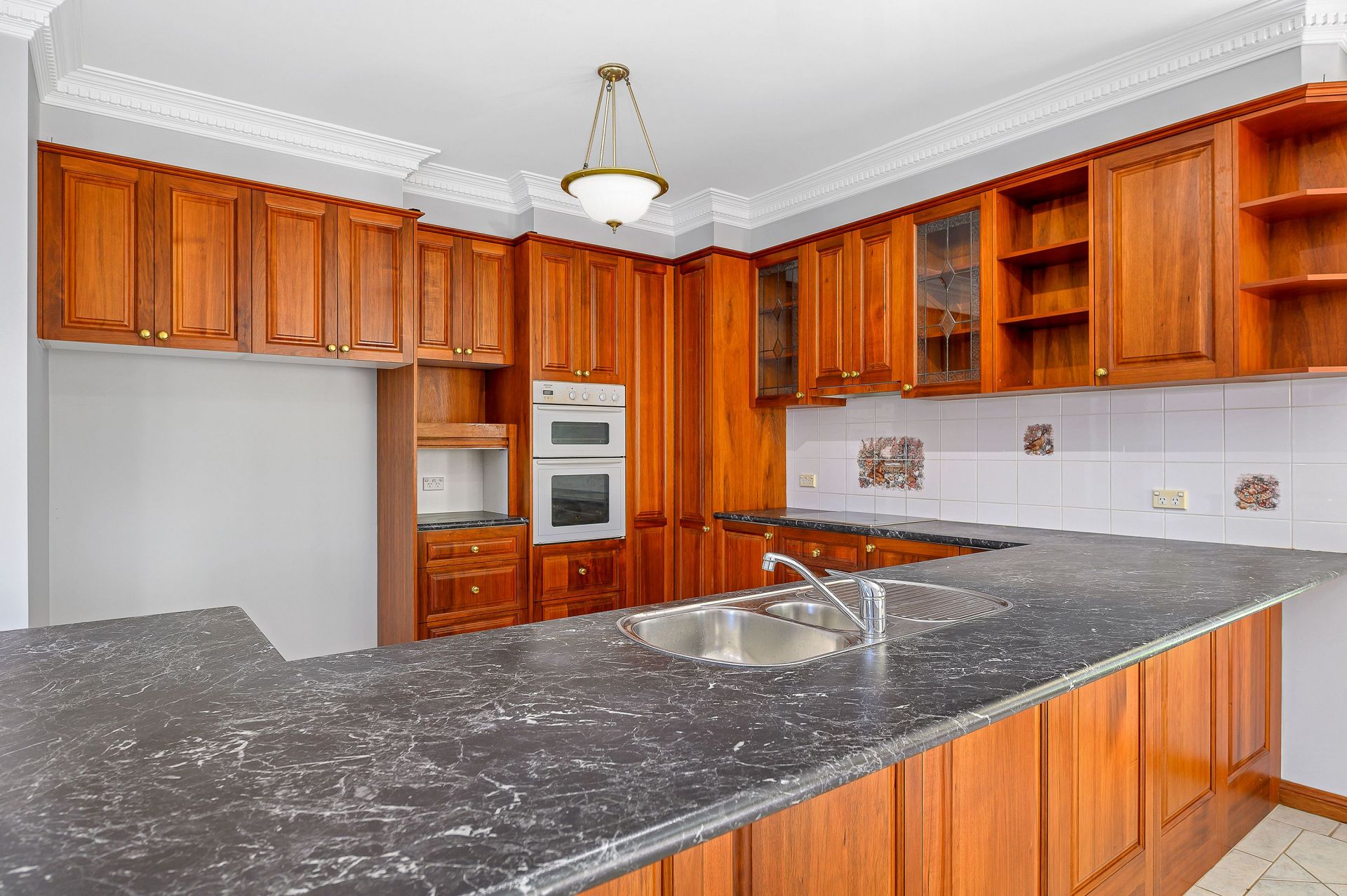 Walk into the open family, meals and large kitchen area. Timber Blackwood kitchen with double oven, induction cooktop and dishwasher.