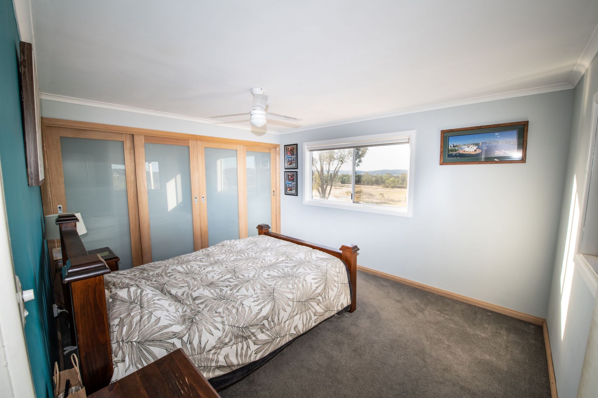 Main bedroom with large built in wardrobes beautiful views and a ceiling fan.