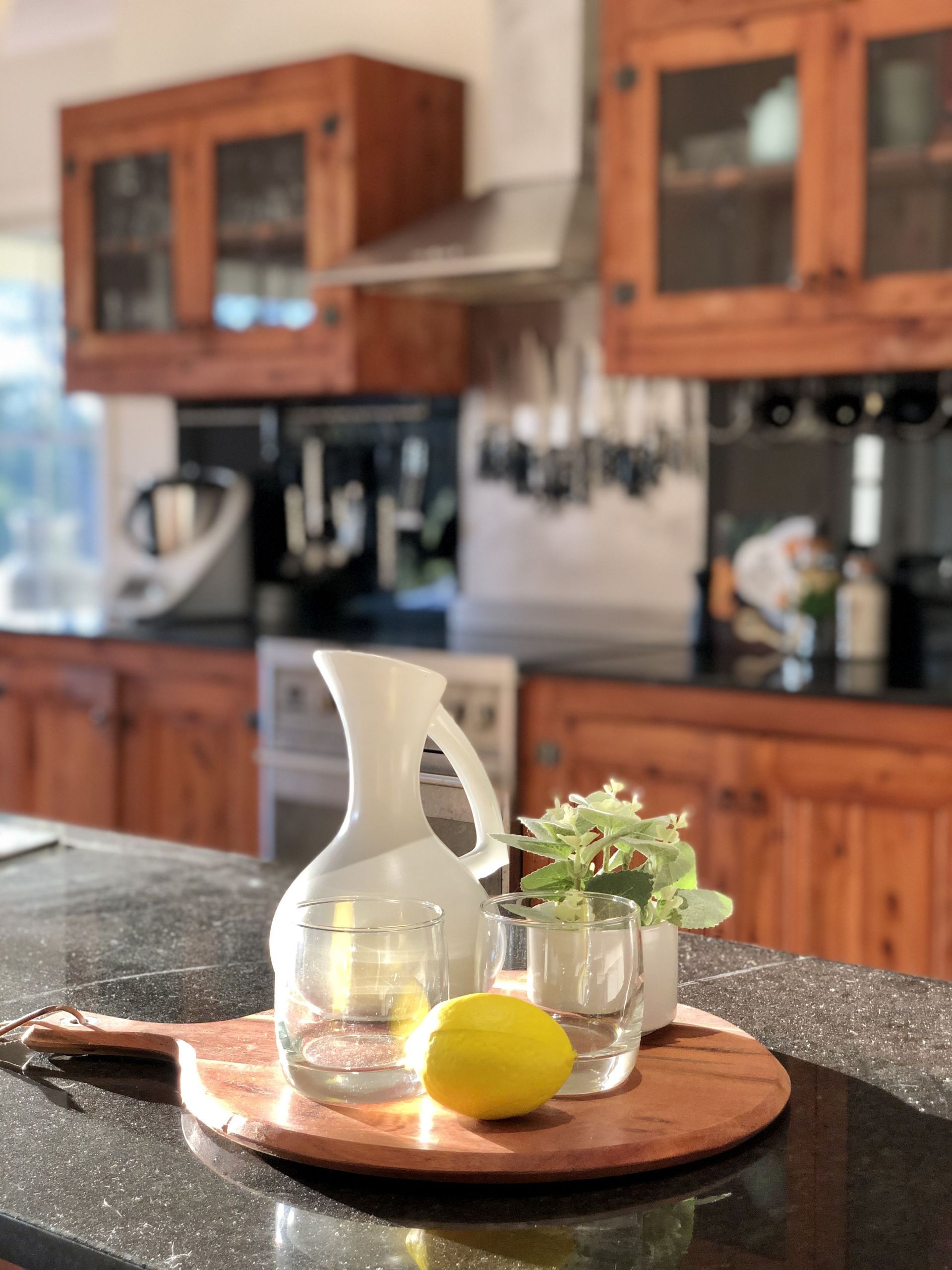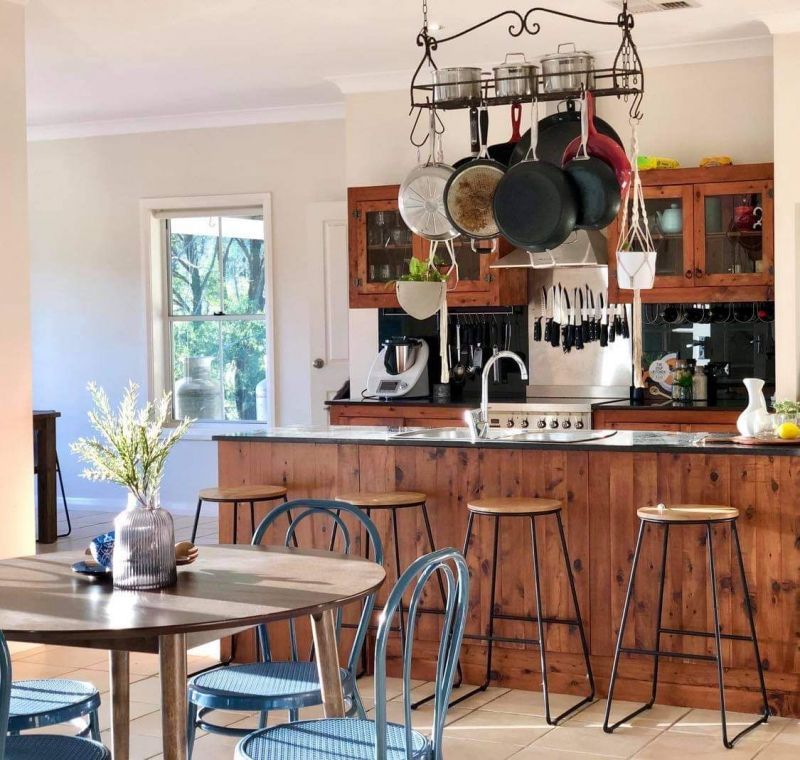 The country style gourmet kitchen offers custom cabinets, stone benchtops, brand new gas oven, double drawer stainless steel dishwasher and oversized walk-in pantry.
