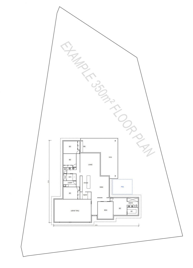 The floorplan is an example only. There are no covenants so you are free to design a house to suit your style, size or storeys. Being a corner block, the driveway access can be from Bellmere Lane or Harvey Road.