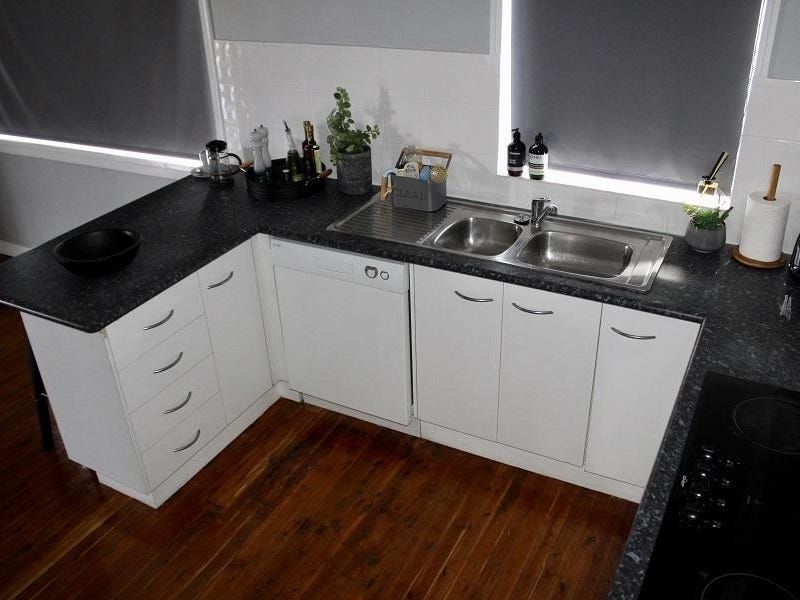The modern kitchen has a wall oven, bench top stove and a dishwasher. There is loads of cupboards and plenty of bench space a double sink and a cosy breakfast bar.