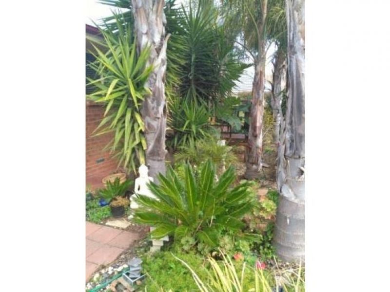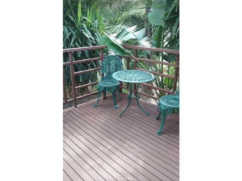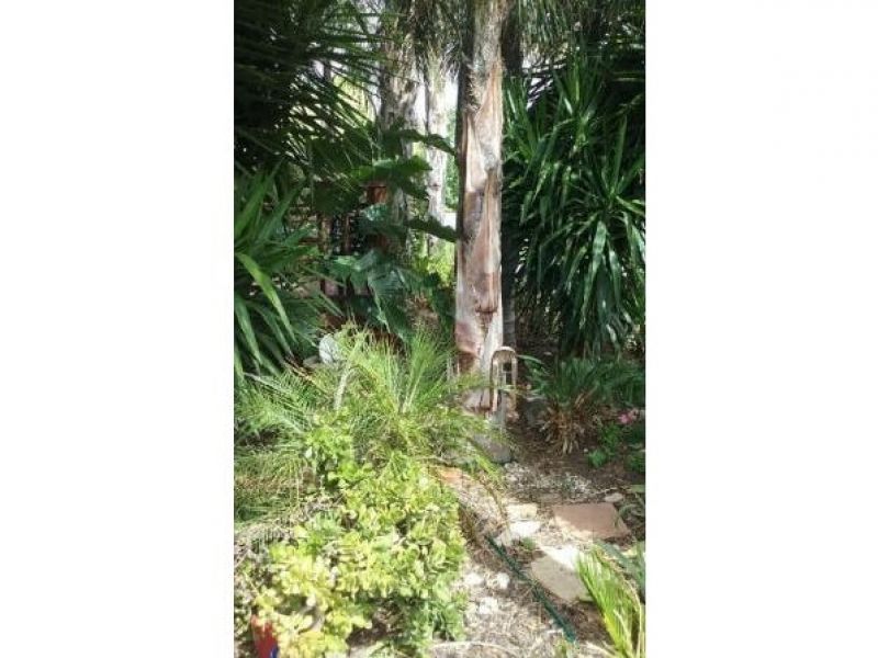 - a beautiful tropical style garden and a tidy backyard and vegetable garden with a tank and tool shed.