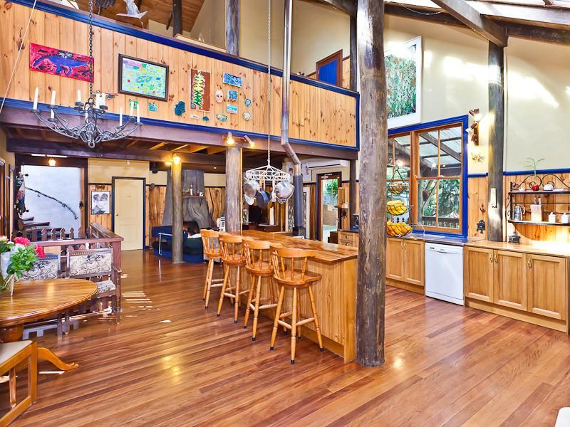 This totally unique home is a place of enchantment. Walk past a waterfall flowing over an enormous sculpted tree as your front door. Enter into the glowing timber oasis of your 3-level pole home, quiet, hidden away, with clean fresh air. Light a fire in the wood stove or sculpted tree trunk fireplace to keep cosy in the winter….or eat dinner on the balcony overlooking the forest, surrounded by fireflies illuminating your summer nights.
