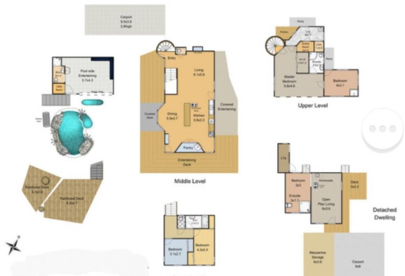 *Main house has 4 bedrooms and 3 bathrooms. The master has an ensuite and adjoining bedroom with beautiful tree-top views. The lower level has two bedrooms with a bathroom and toilet.