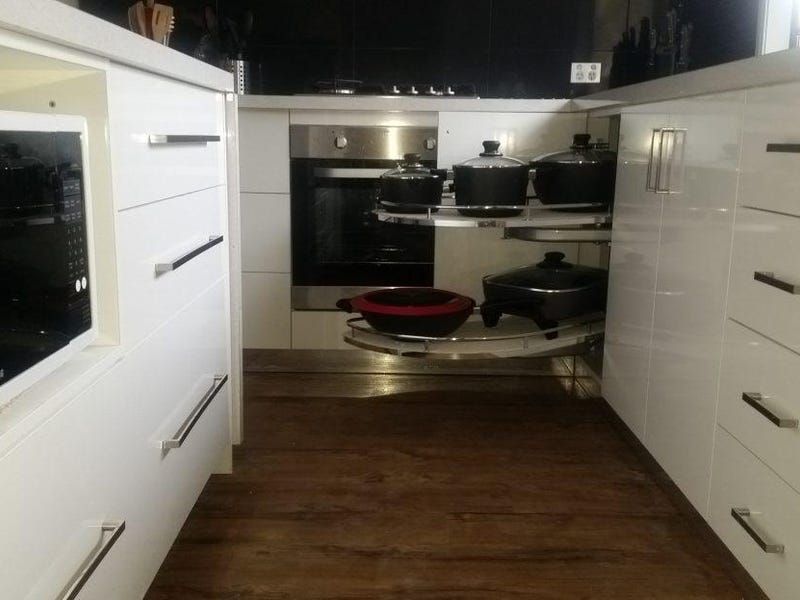 The custom designed kitchen has excellent storage and food preparation space. It features a gas cooktop, an electric oven and range hood, an underbench alcove for a large microwave, large pot drawers and space for a large refrigerator. Adjacent cupboards can be used for additional storage.