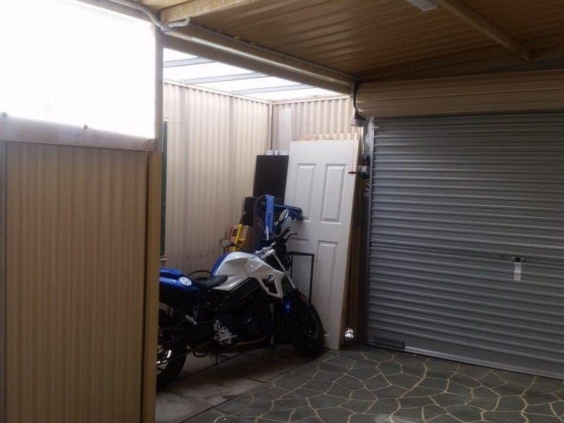 The extra wide enclosed carport has a remote controlled roller door, a