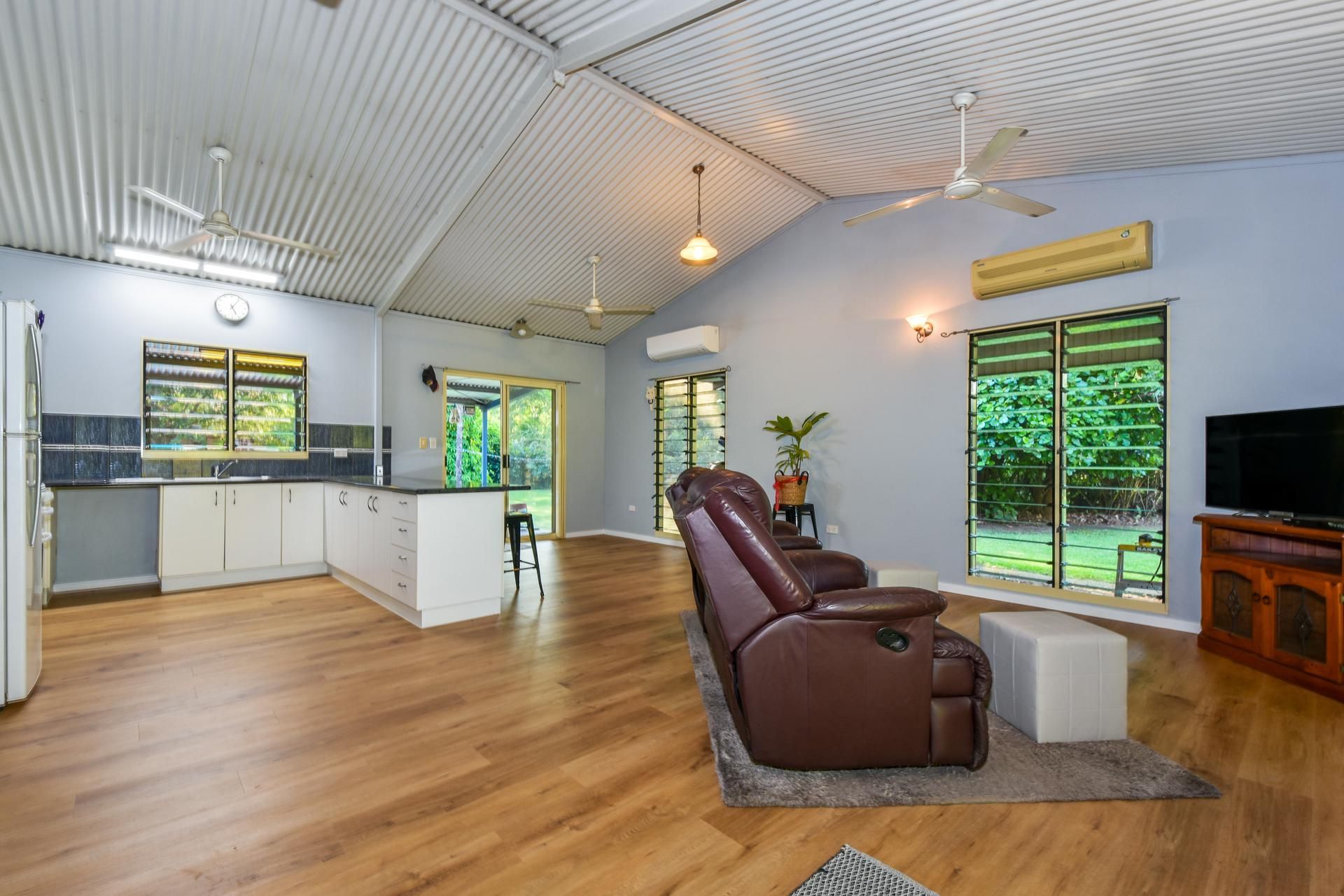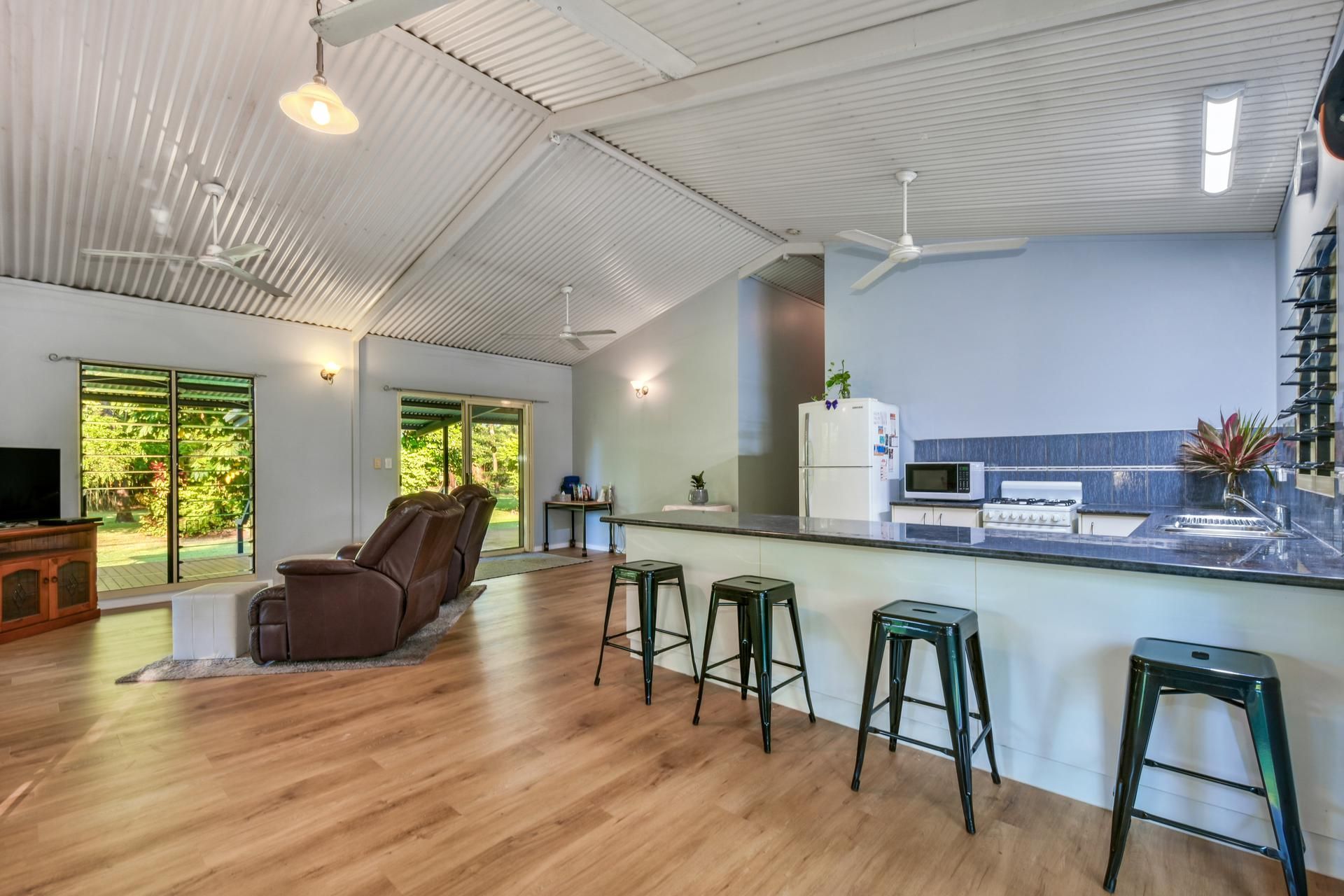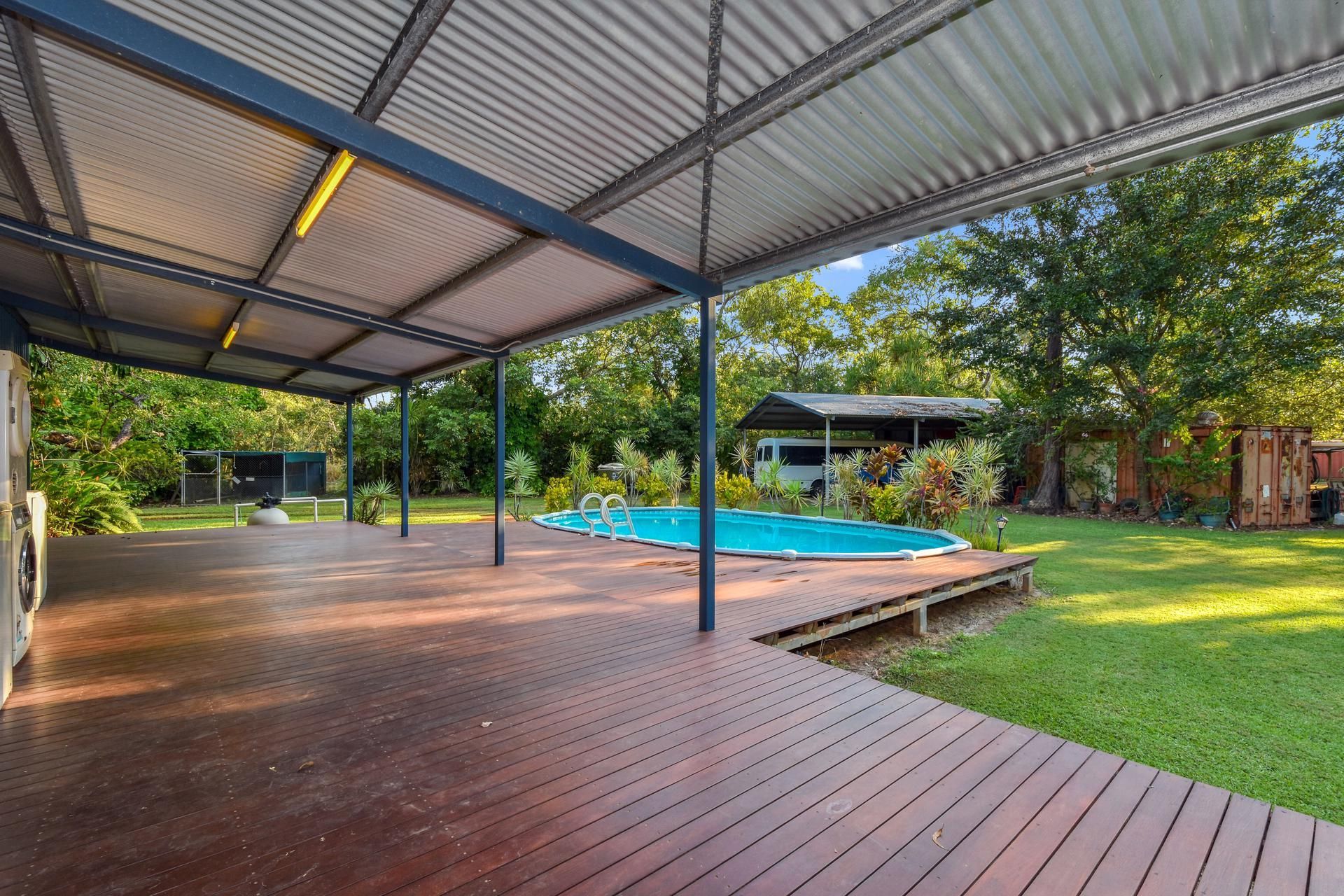 Tucked in the middle of this oasis is a lovely 3 bedroom home. All bedrooms with robes and airconditioning. There is a tidy bathroom and a lovely practical kitchen. The whole house has just been upgraded with floating timber floors throughout. The internal living area too is airconditioned, but you'll probably spend your hours relaxing on the spacious front or rear verandahs among the trees and birds. Jump off the rear verandah into the inviting pool. It's an above ground pool partially sunk in, and it all looks great and is very practical.