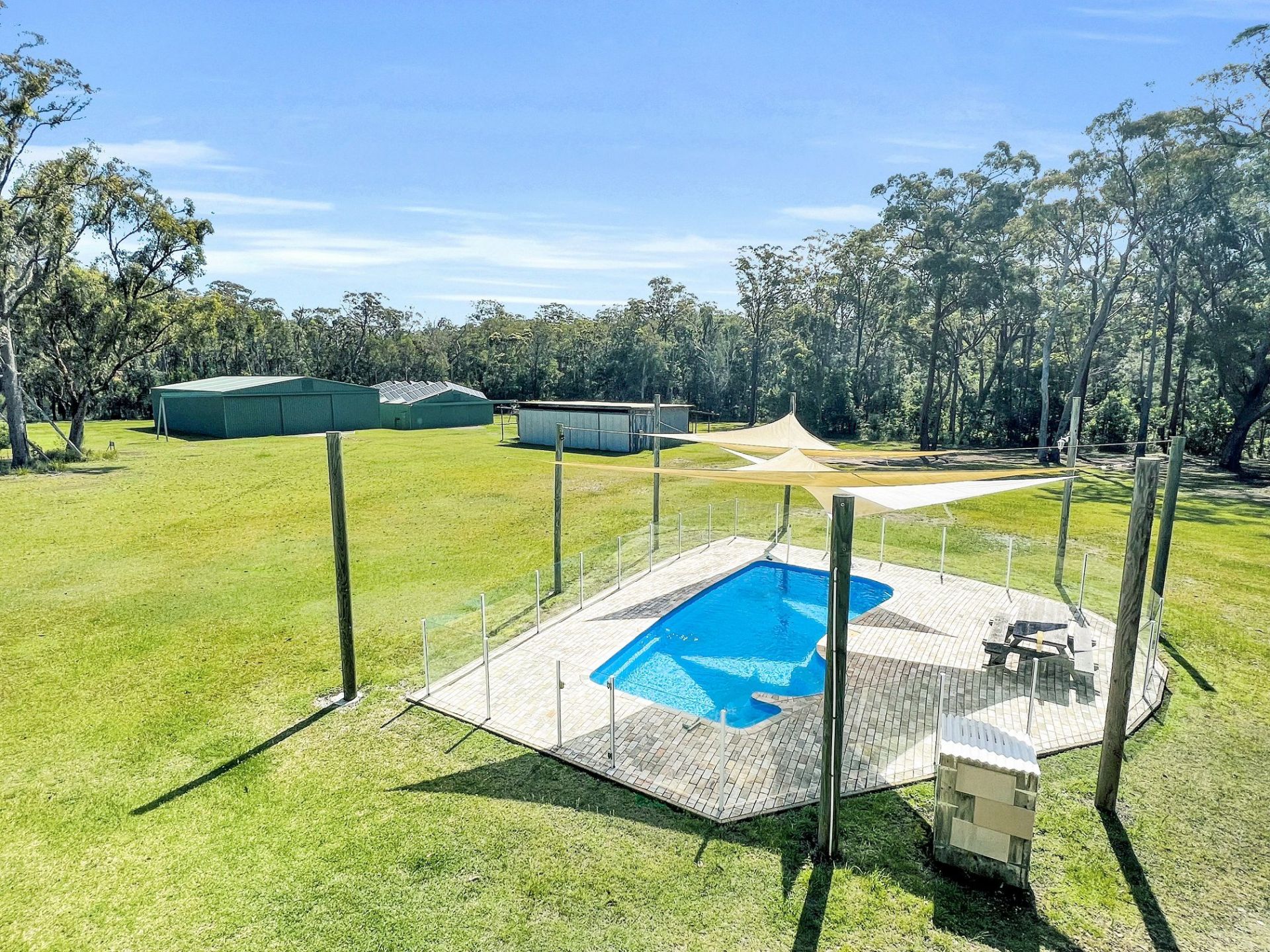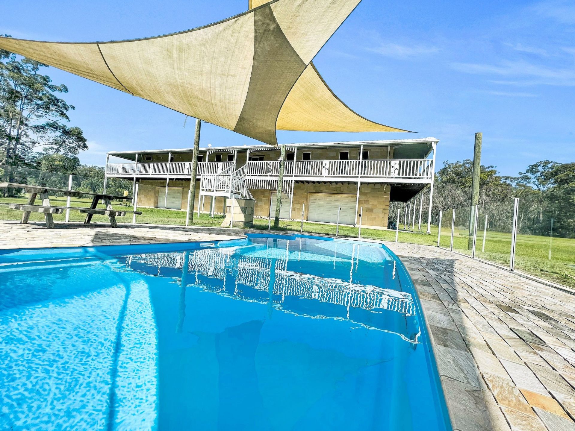 In Ground 35,000 Litre Swimming Pool with clear glass fencing and overlapping overhead sunshade cloths