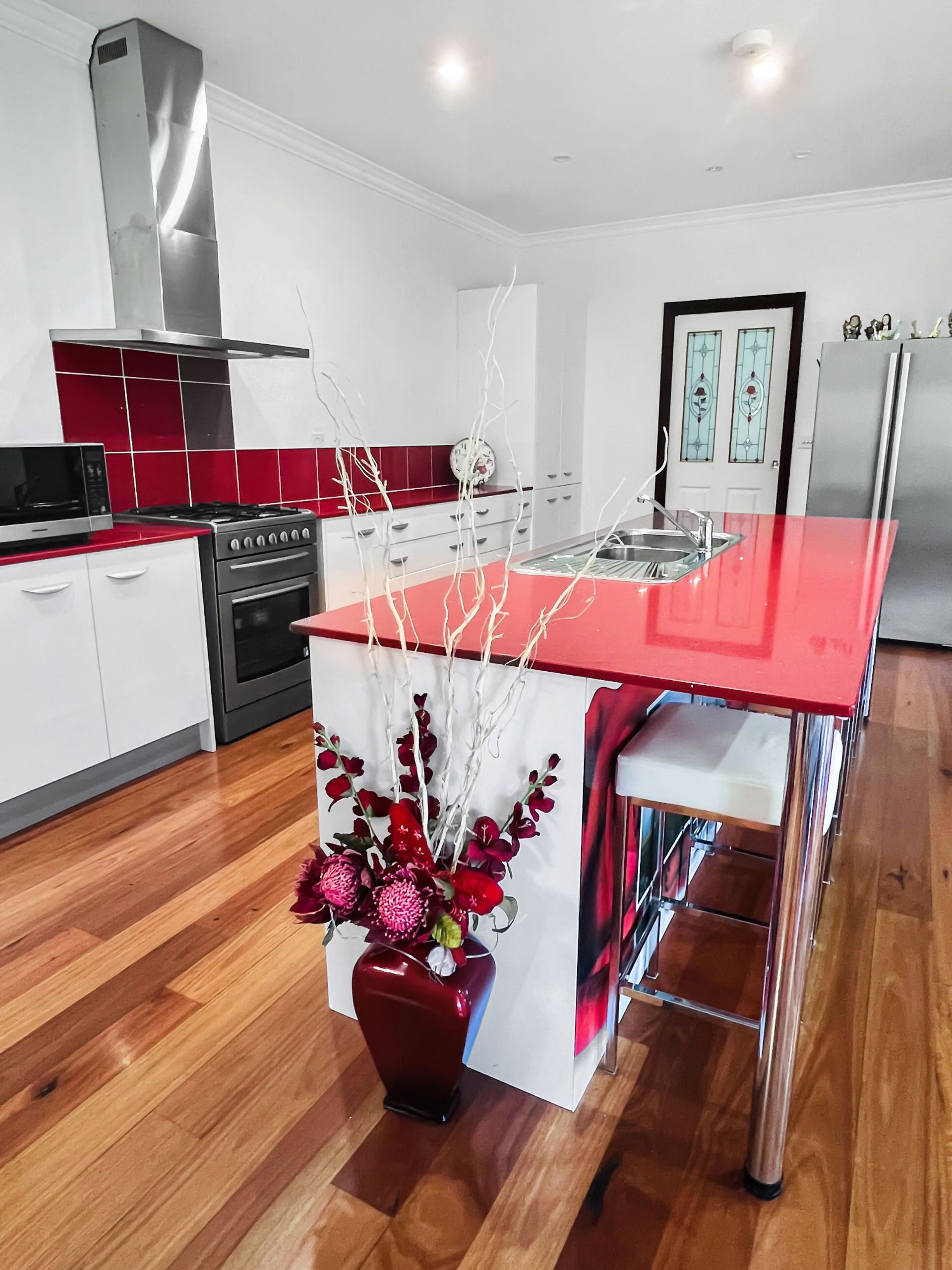 Modern kitchen with large island servery / sink / breakfast bar all with Edstone Marble benchtops