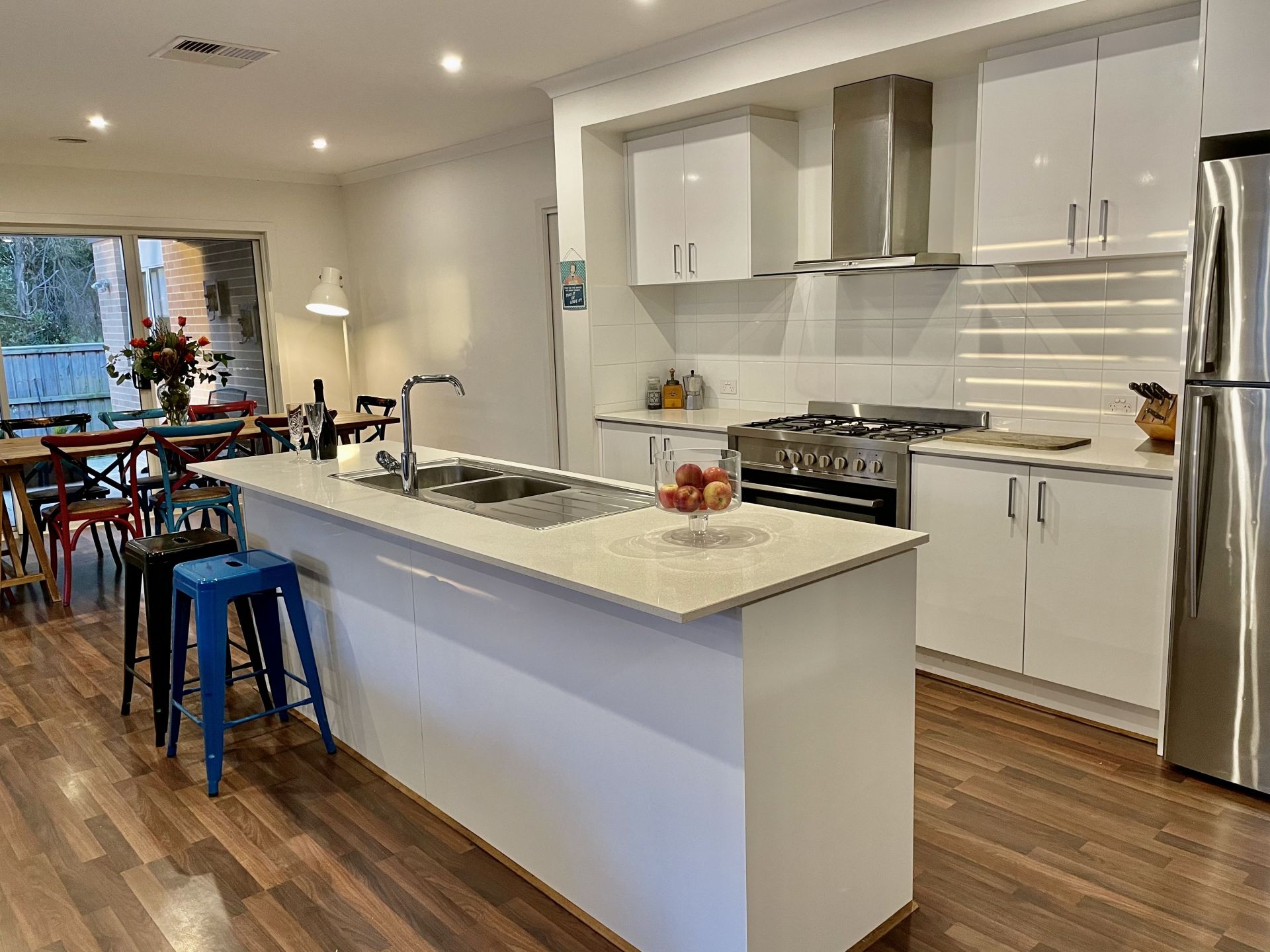 Stone bench tops to the kitchen as well as an impressive walk in pantry and 900mm free standing gas cooker add further to the quality.