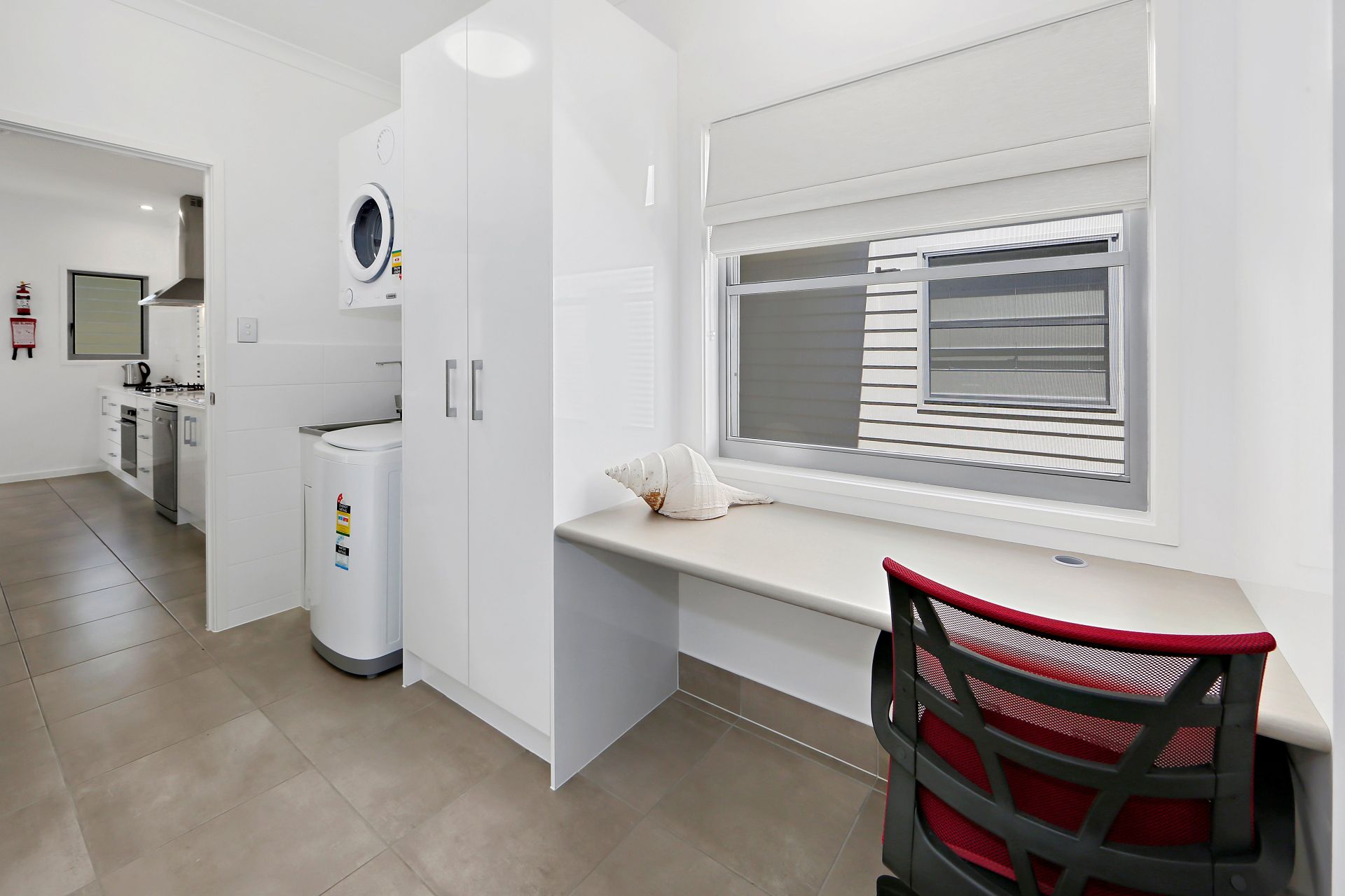 - Open plan modern kitchen with stainless steel gas cooktop, electric oven, exhaust, pantry, dishwasher with extra cupboard space