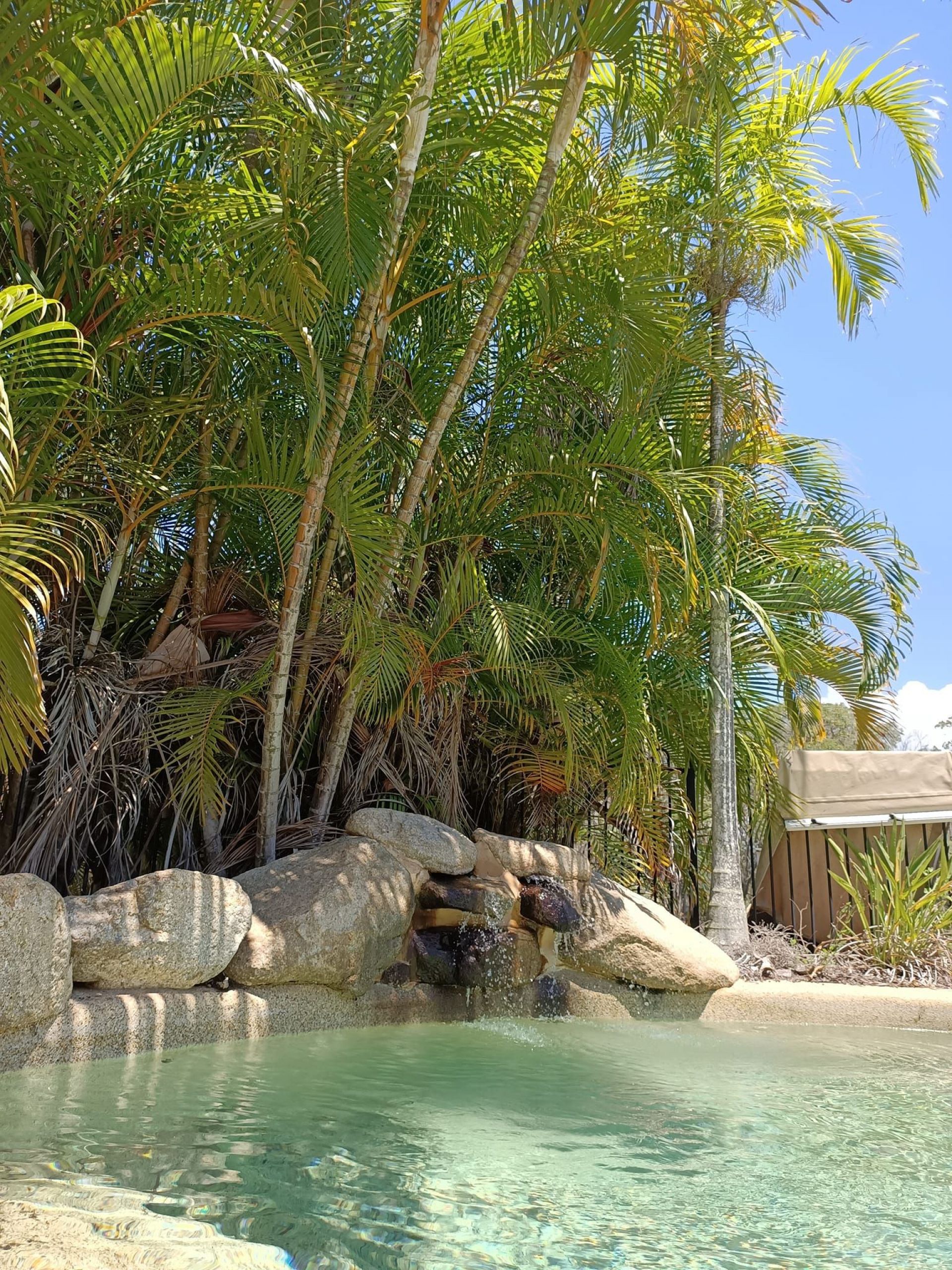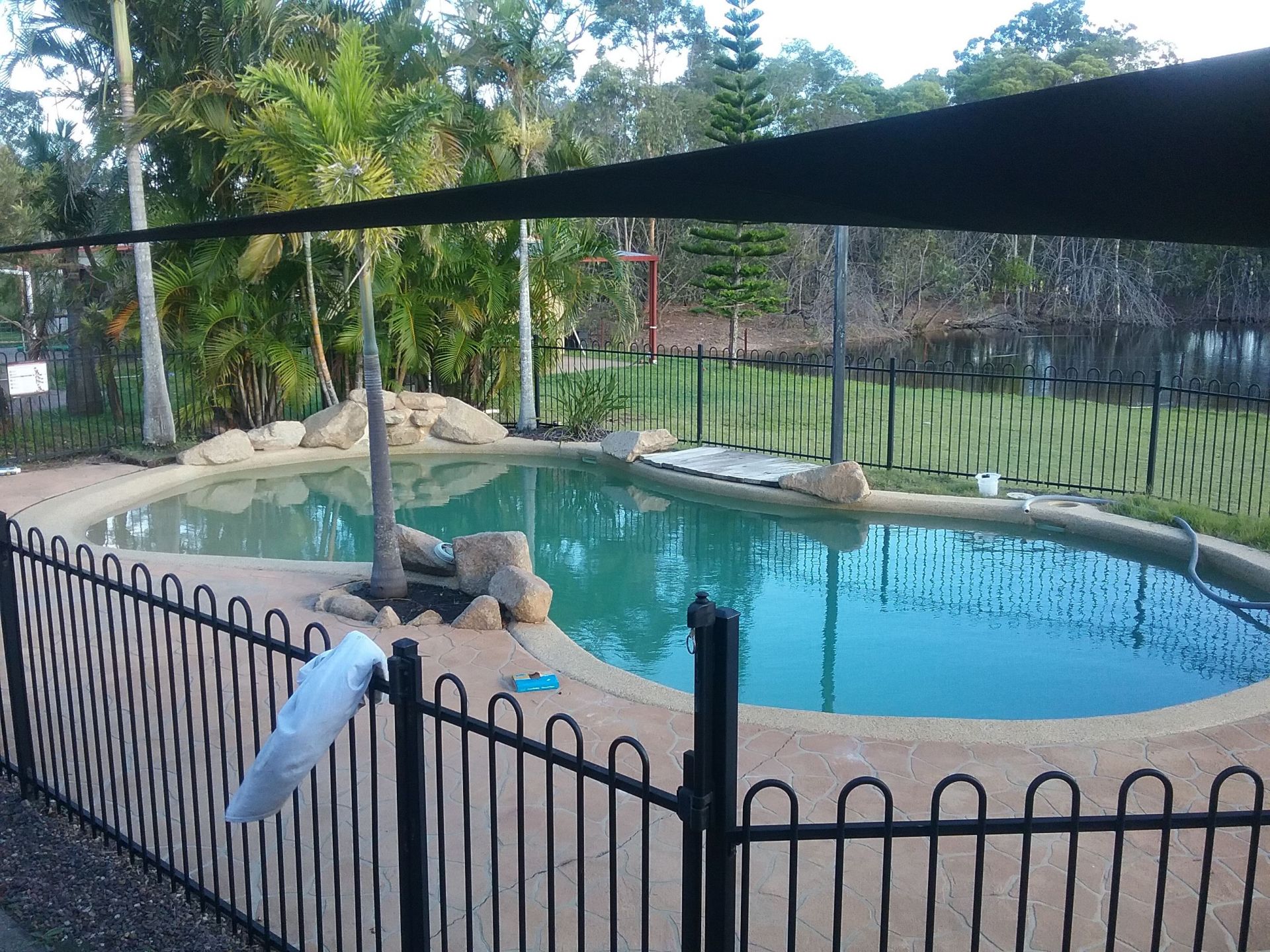 Shade cloth to pool and palm trees.