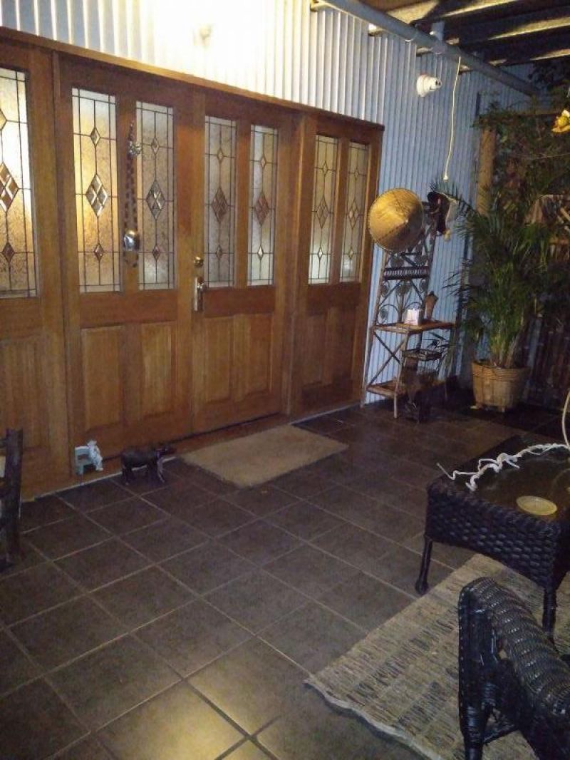 Entrance to main house has delightful courtyard with magnificent lead light doors, leading into large open plan living area & dining area with high ceilings & ceramic tile floor.