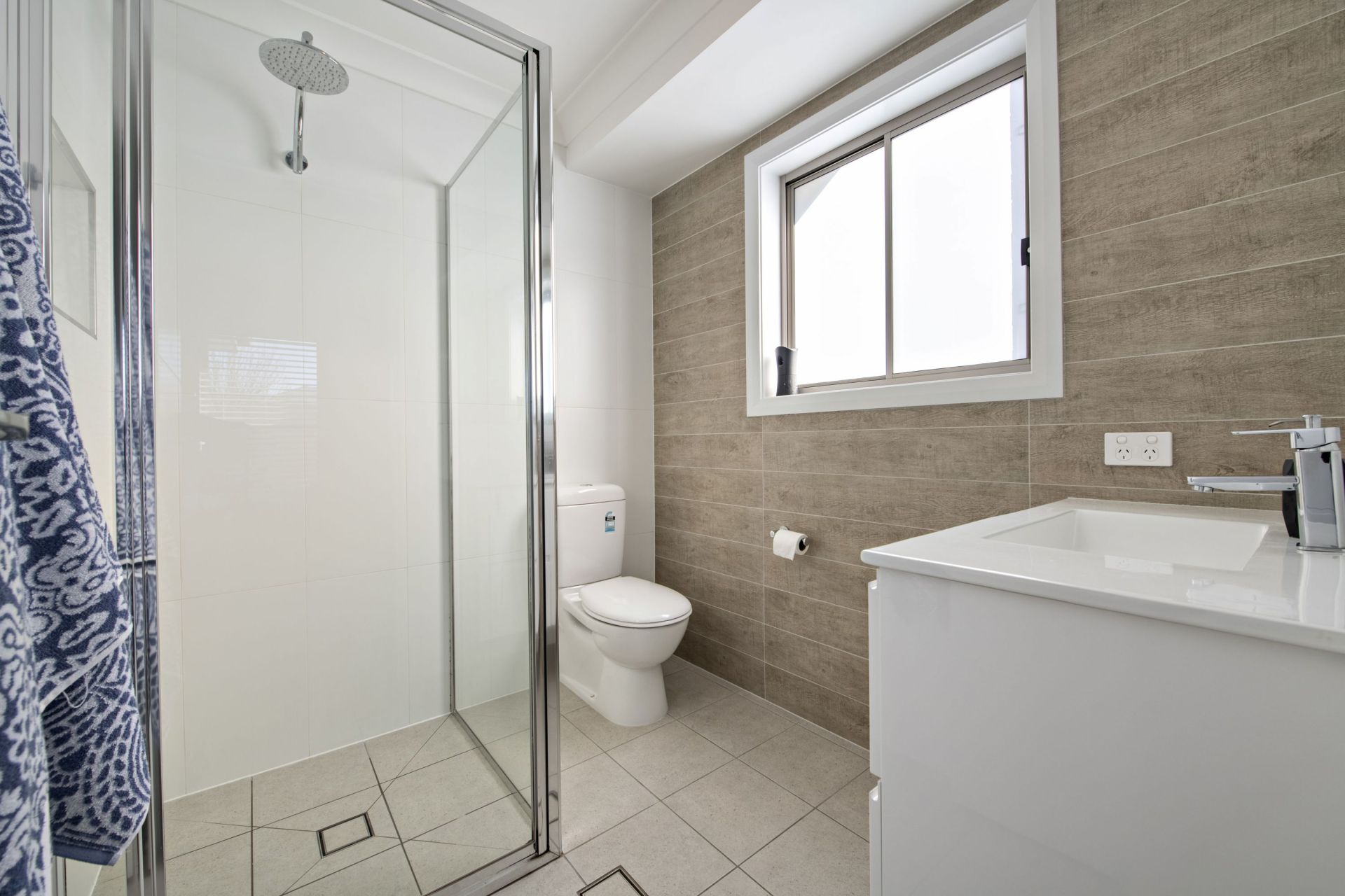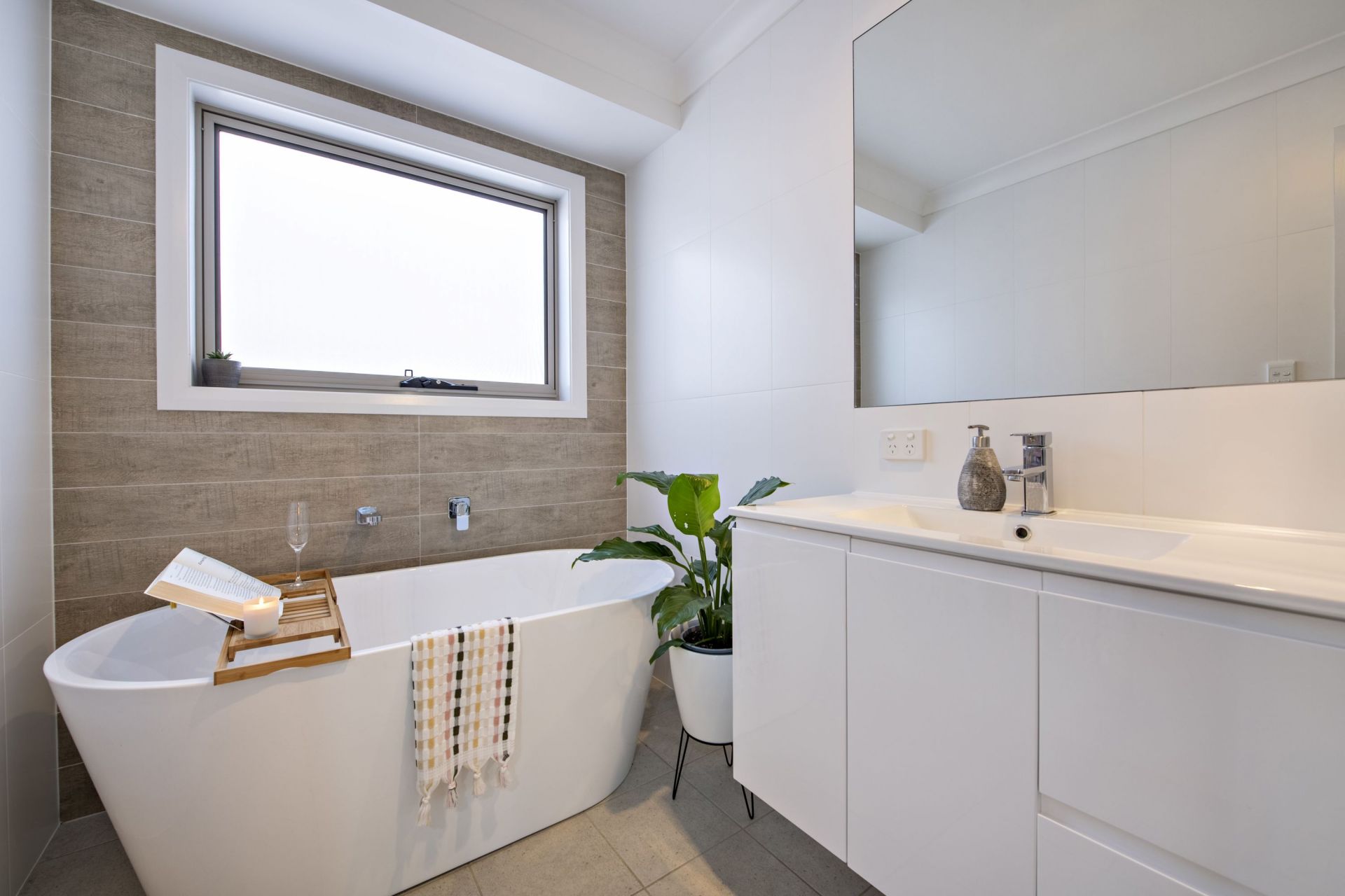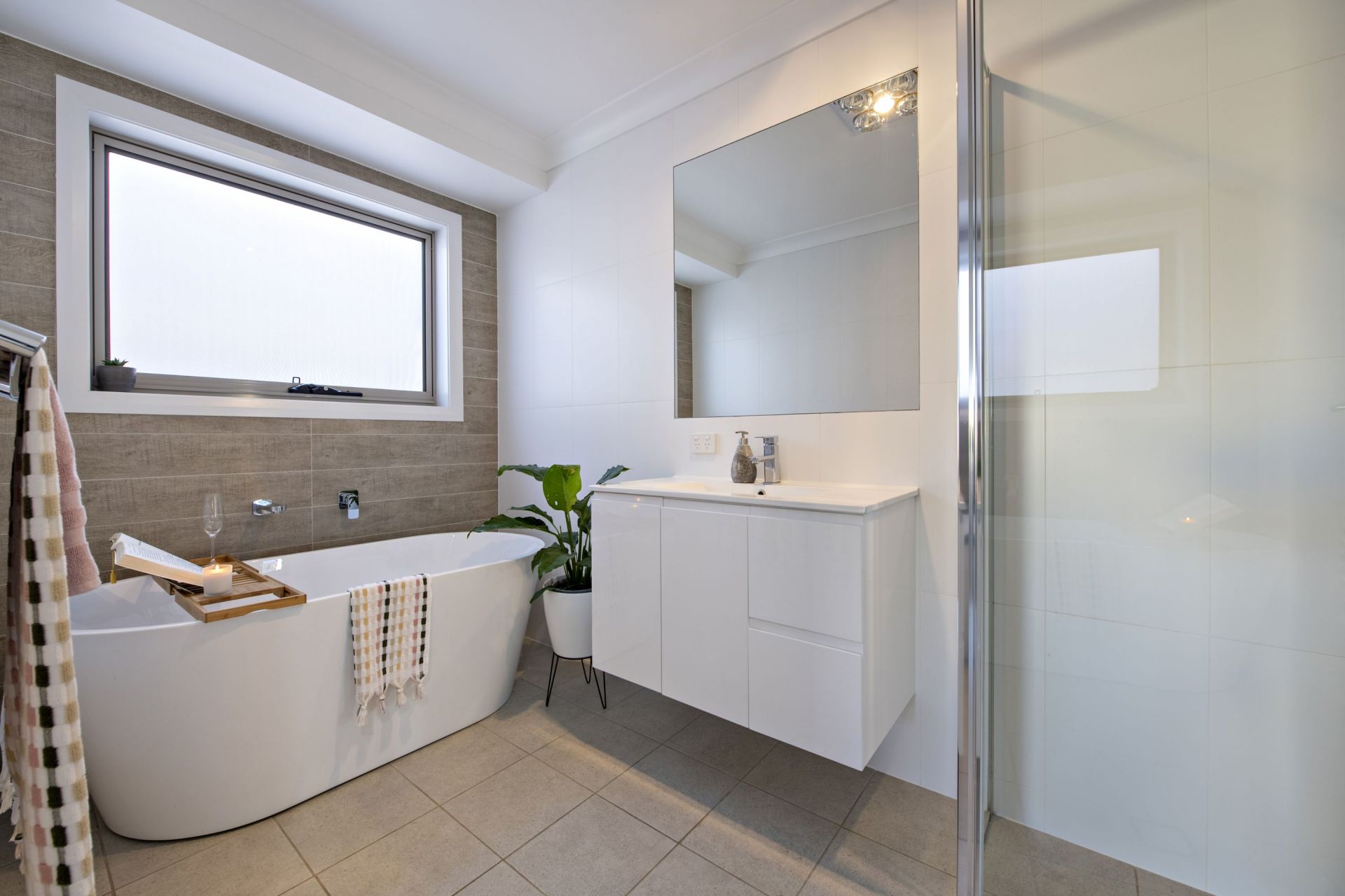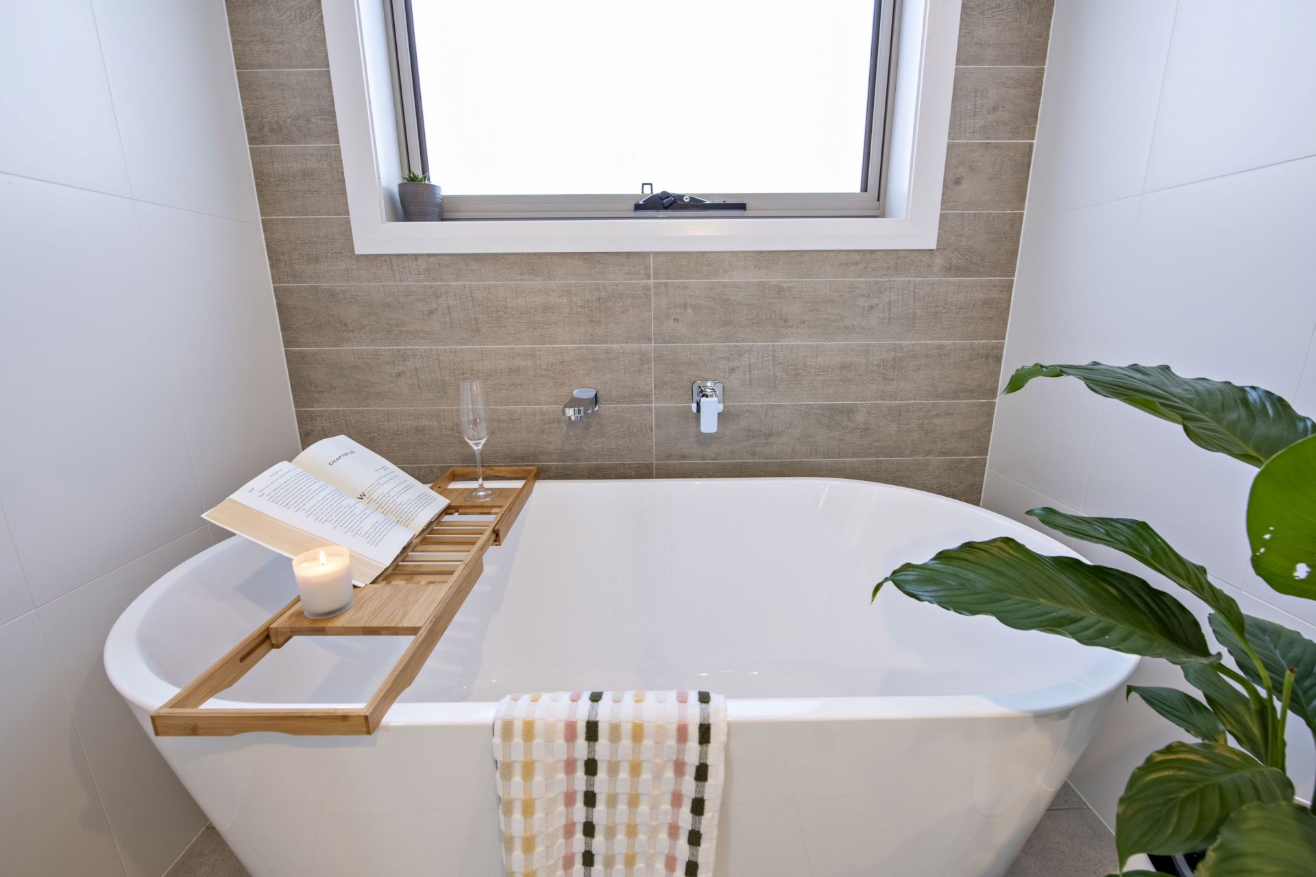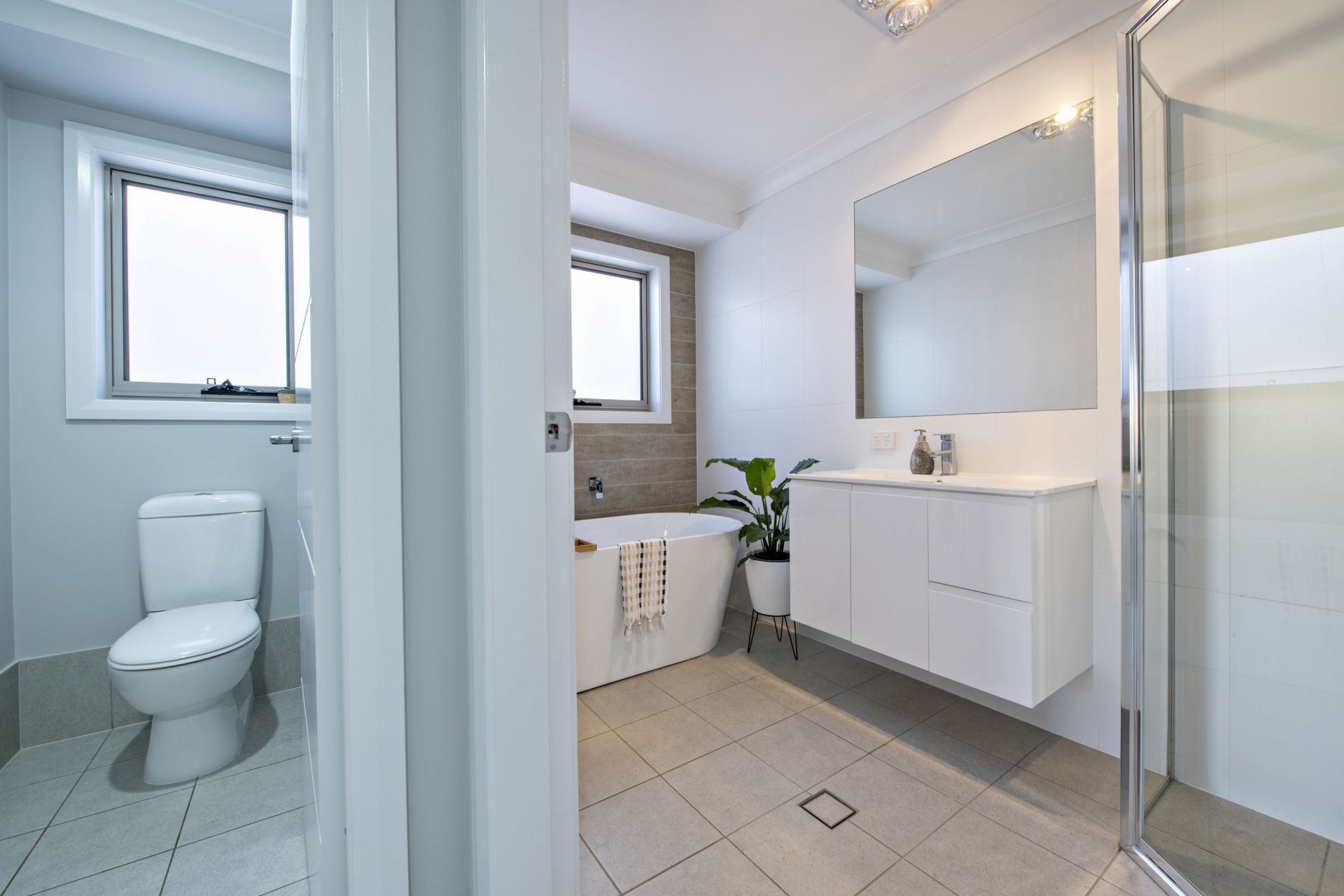 - Main bathroom with freestanding bath and separate toilet, floor to ceiling tiling in both bathrooms