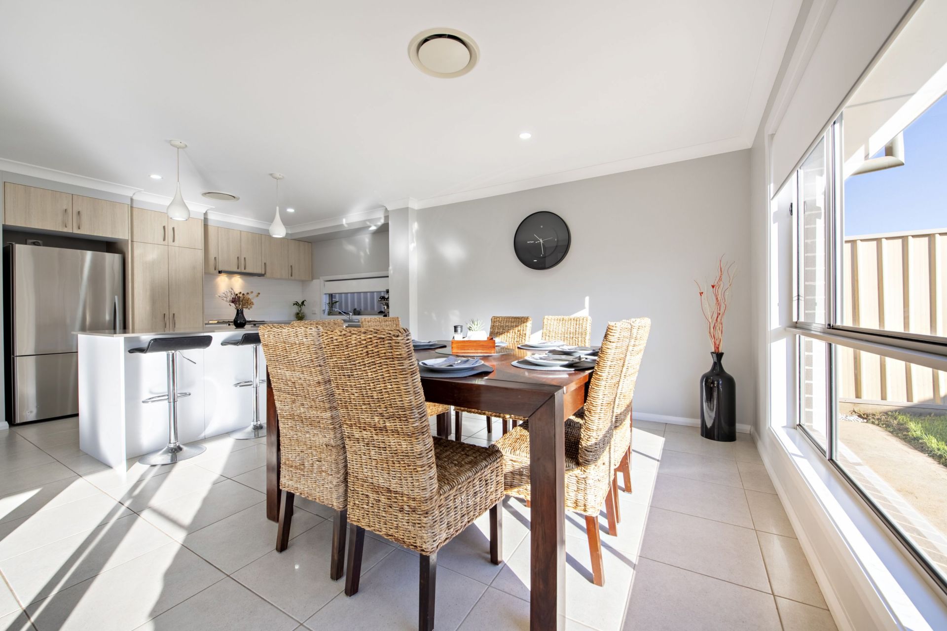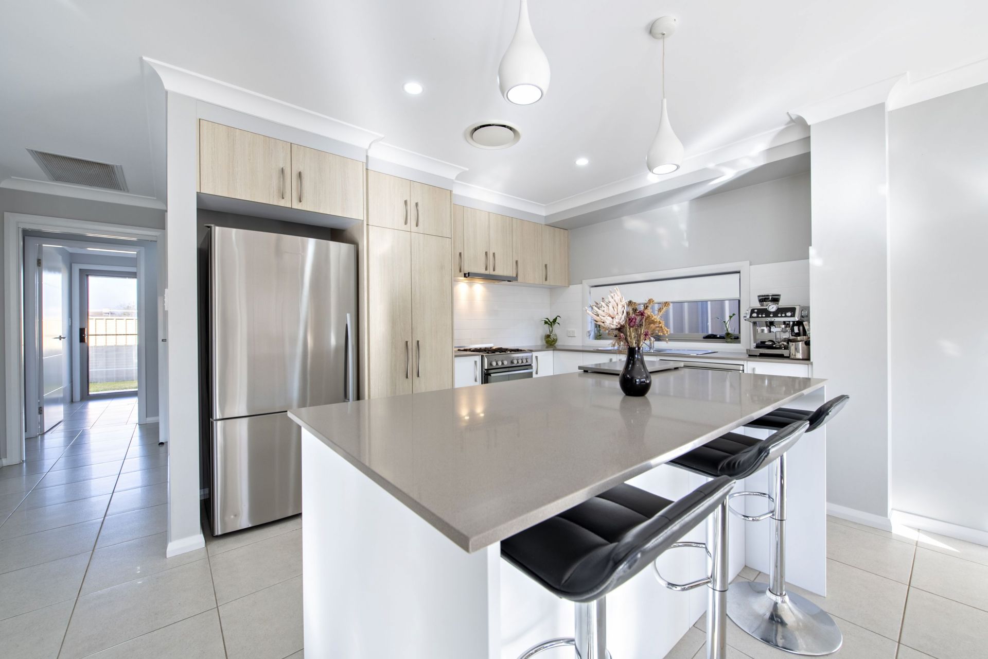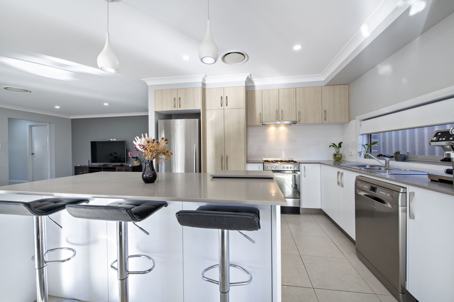 - Kitchen with Caesarstone benchtops, Ariston Stainless appliances and water point for fridge