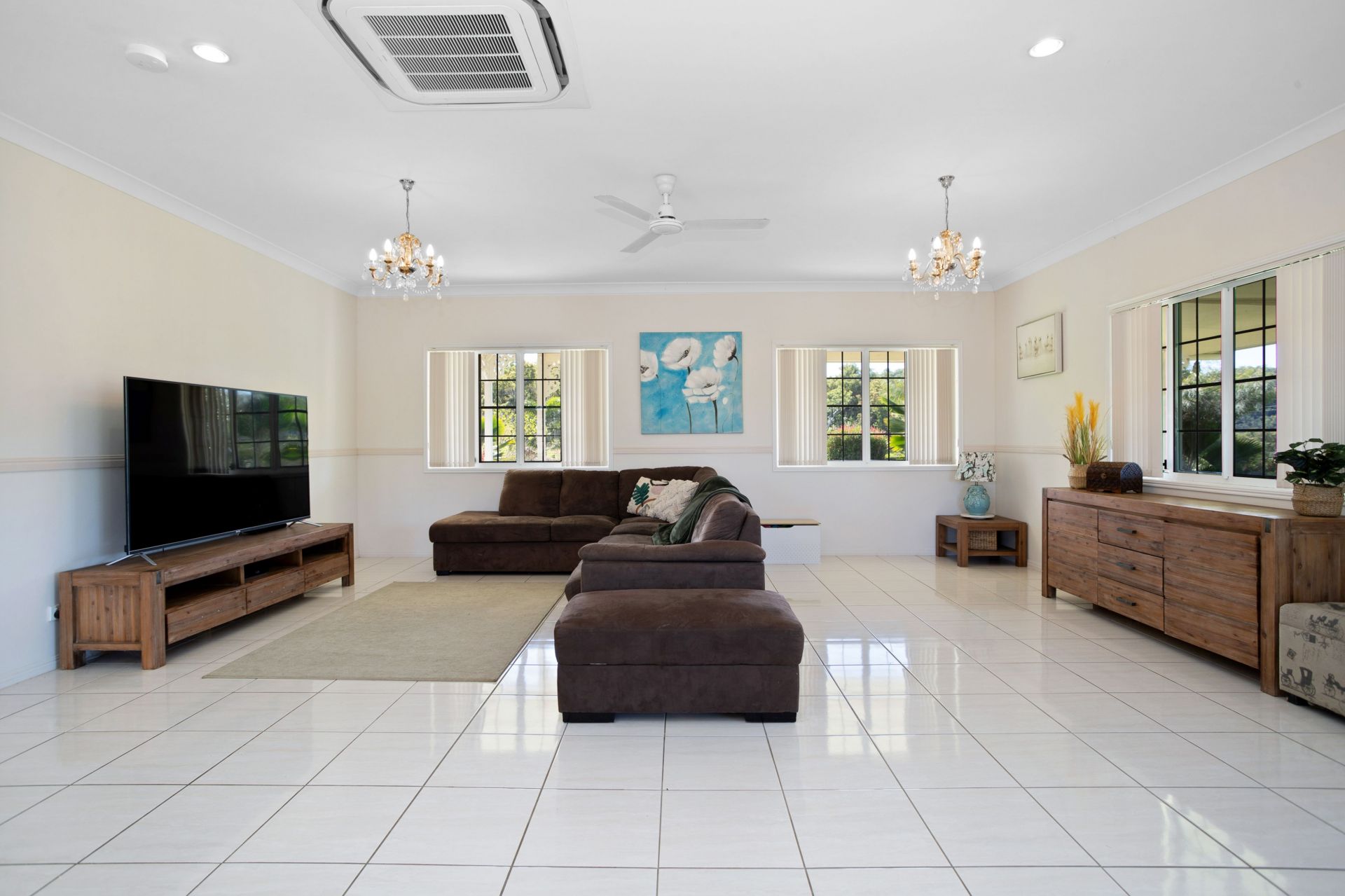 Chandeliers in main entrance and main living and dining area.