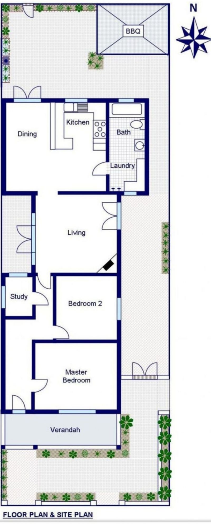 A generous size open plan living area adjoins the kitchen and faces north to the back courtyard allowing in plenty of natural light. There is an additional living space forward of this with French doors to each side.