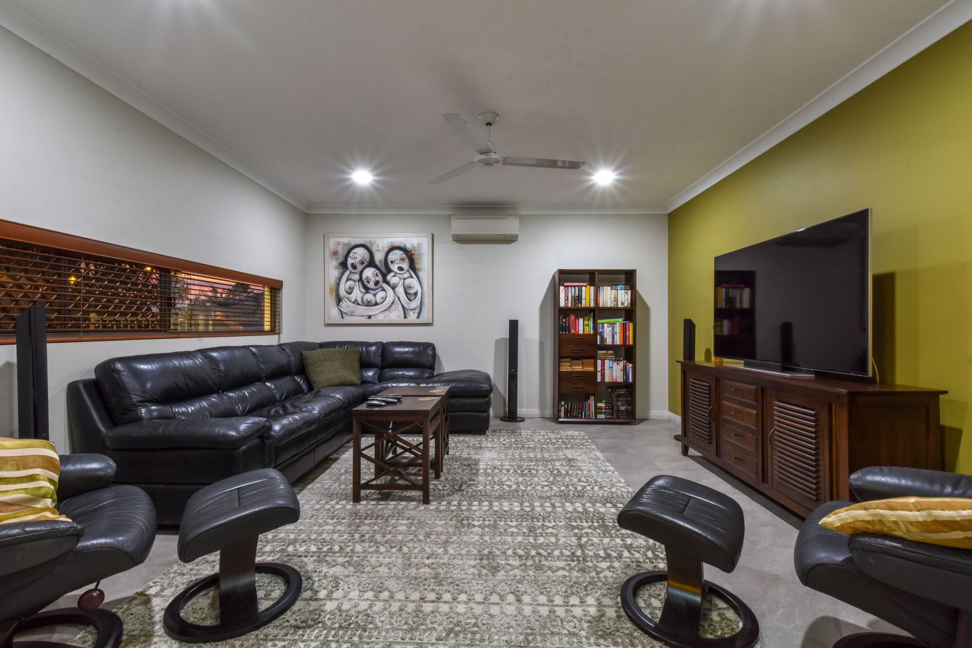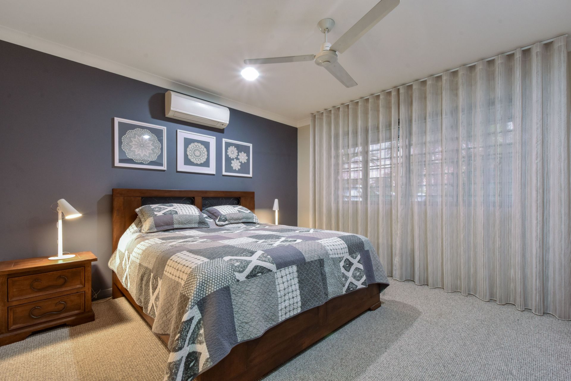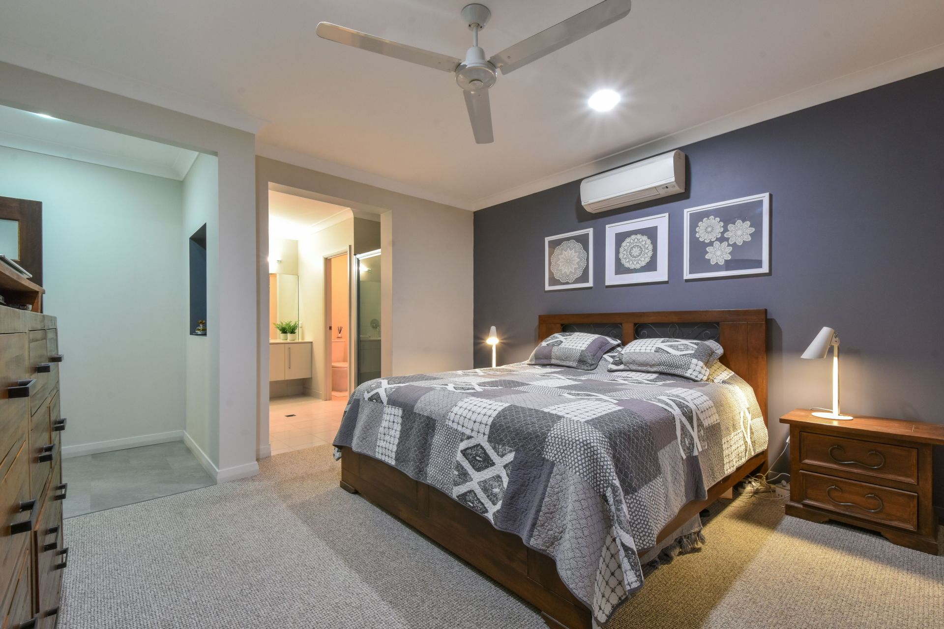 A lavishly appointed master bedroom suite is a highlight within this already impressive abode; with a generous layout that includes a walk in robe and lux ensuite bathroom, soft carpeted flooring and floating ceiling mounted curtains that waterfall over the banks of louvered windows.