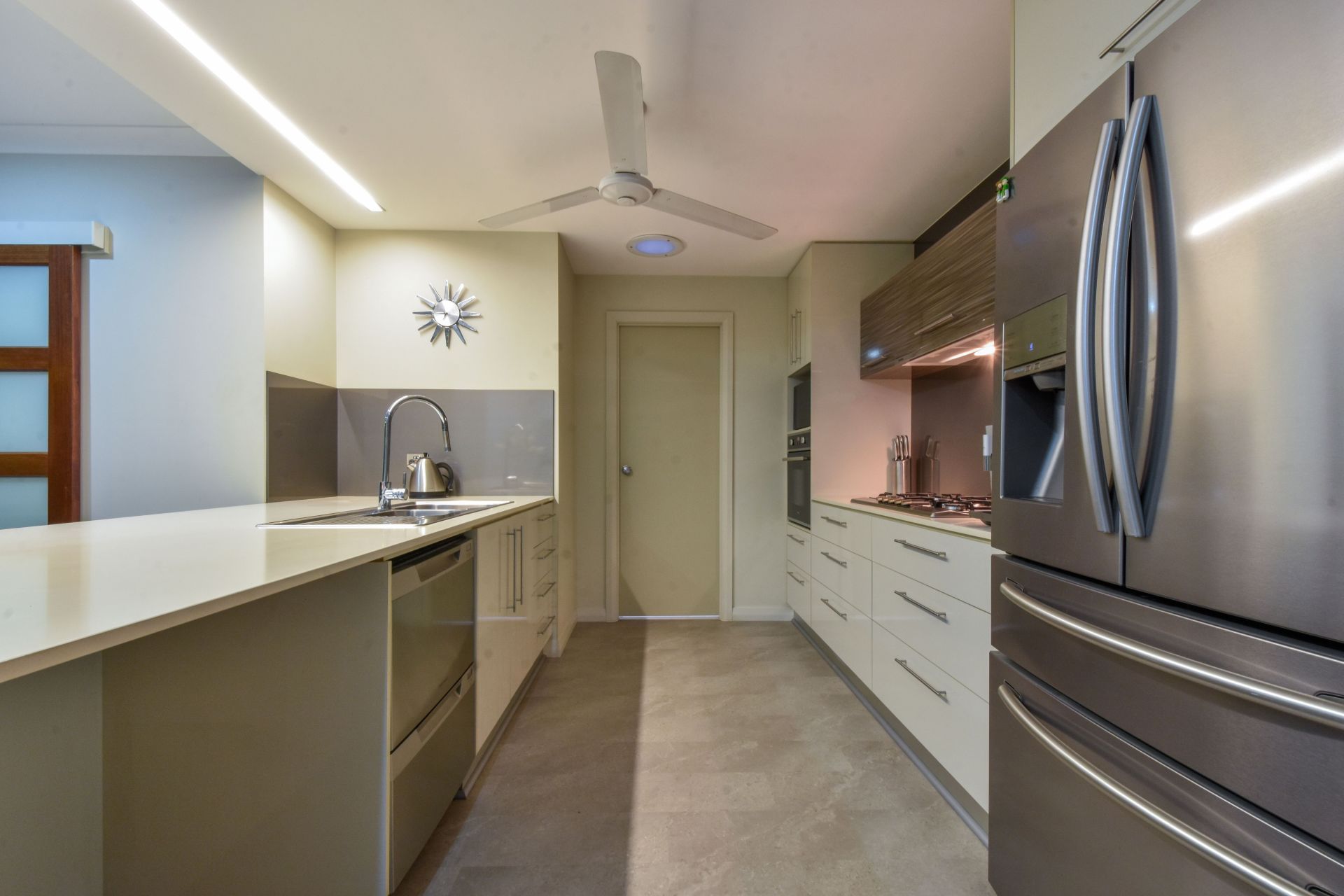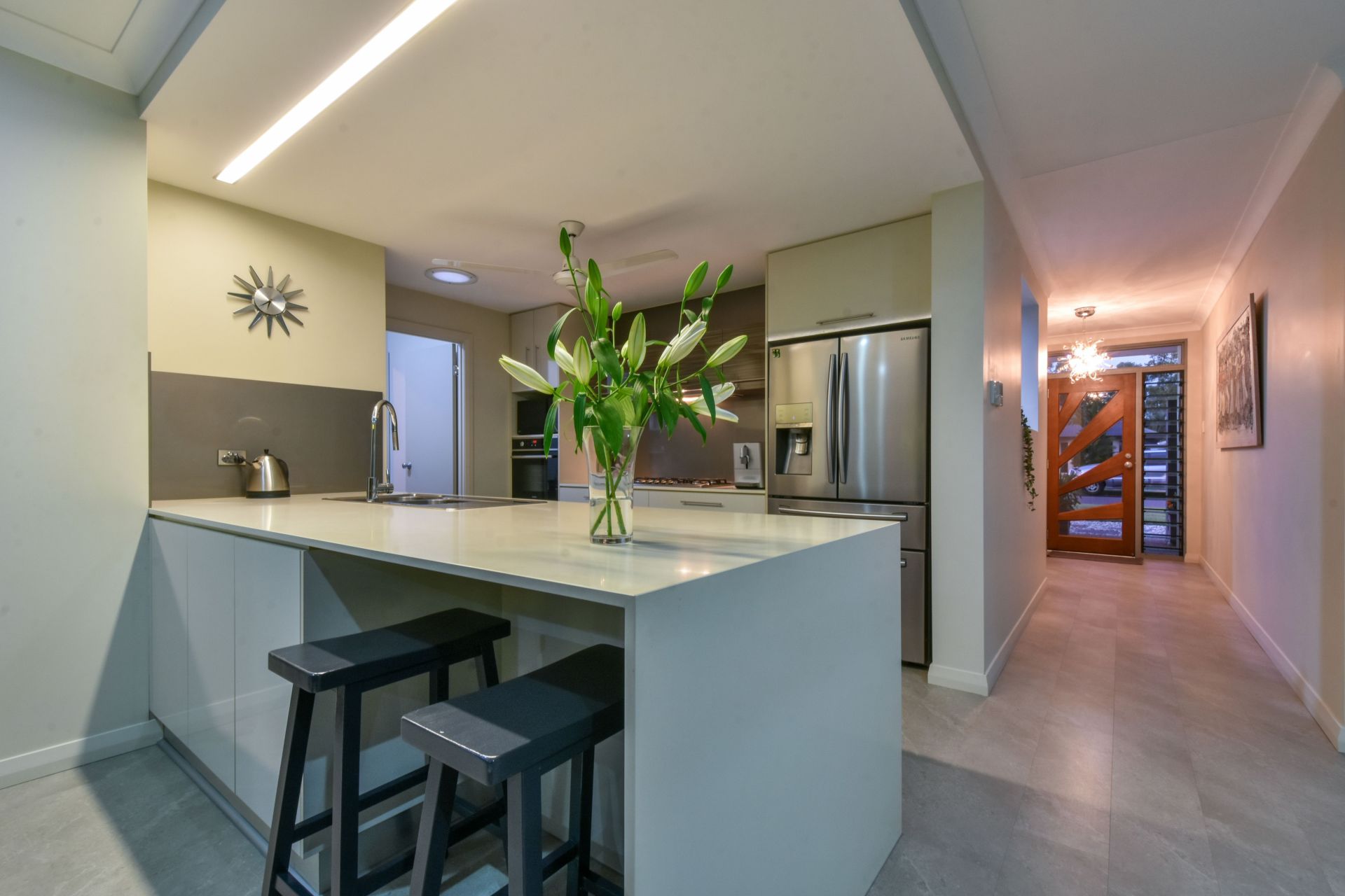 From the street, this home presents with a double garage and formal front entry with a screen of tropical gardens down the sides to add a layer of privacy and tropical colour to this elegantly appointed home. Inside is a sweeping open plan living and dining area with dual sliding doors through to the media room and the outdoor entertaining areas alike - this home is designed with function and finished with impeccable taste. The kitchen offers stone counters and a double dishwasher, overhead storage and breakfast bar seating and walk in panty.