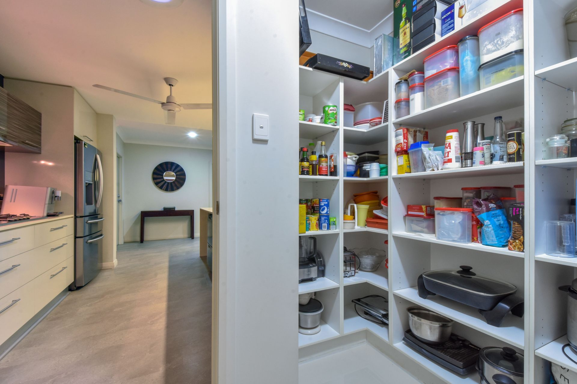 • Walk in pantry, stone topped breakfast bar, overhead storage in kitchen