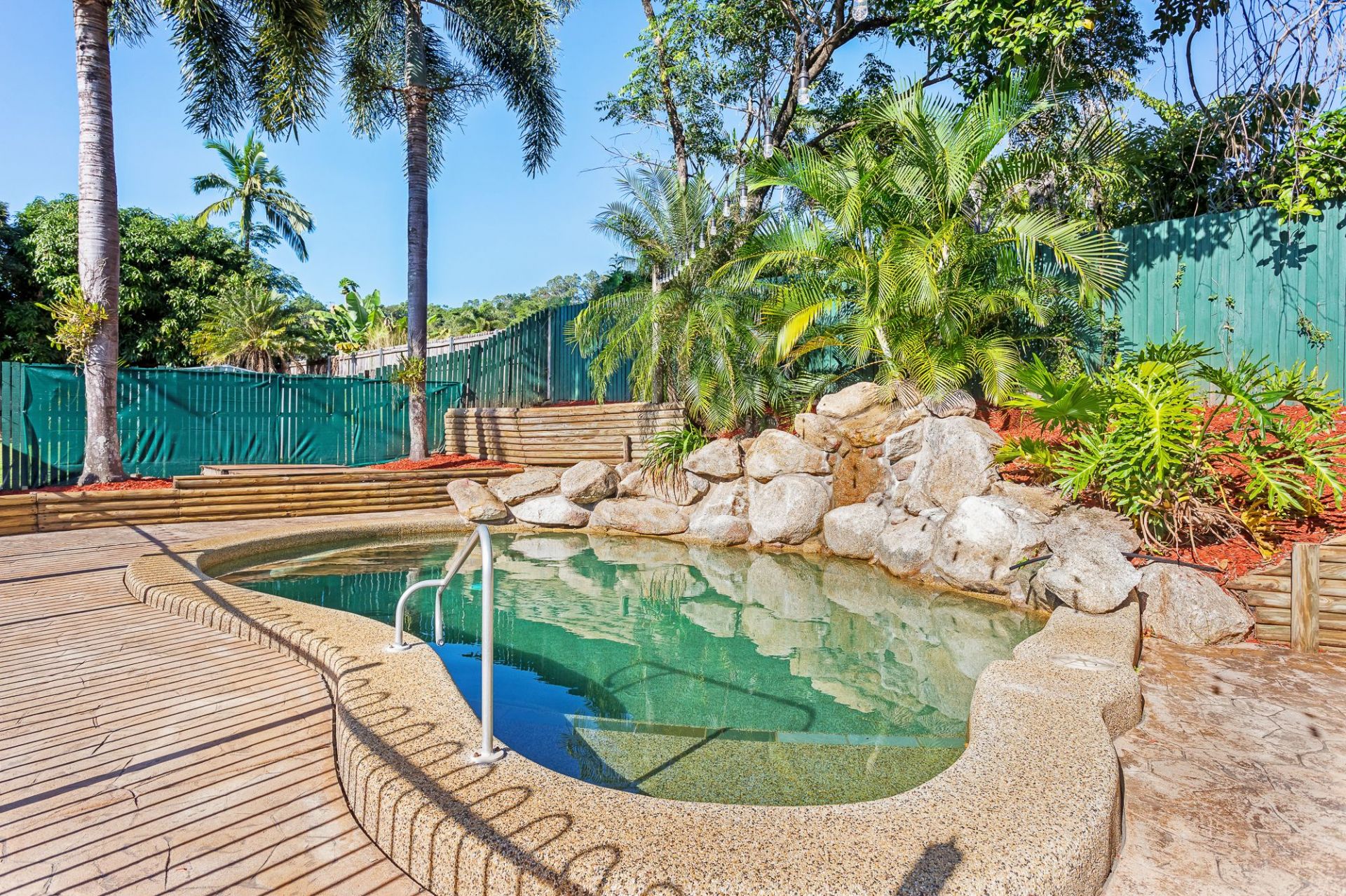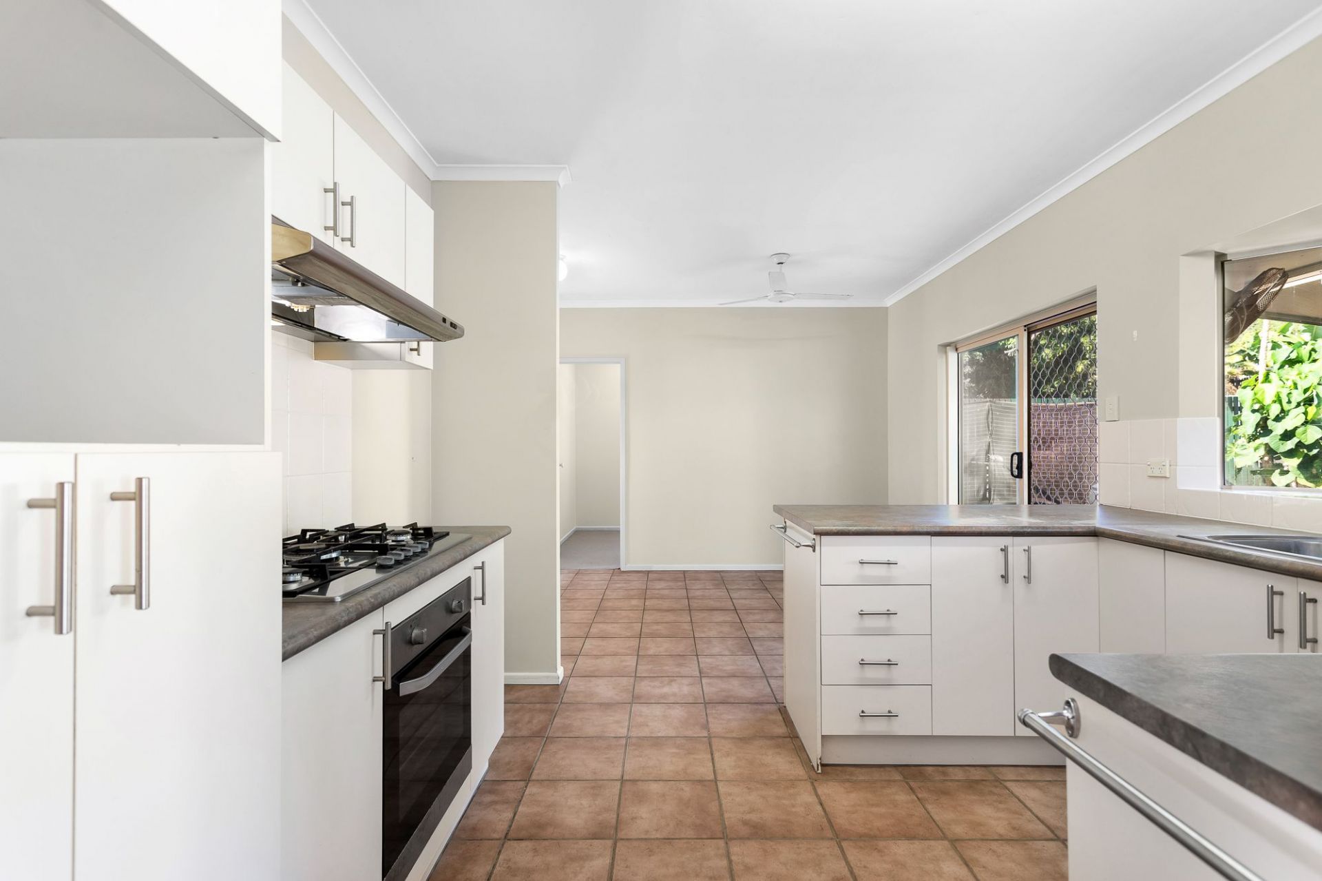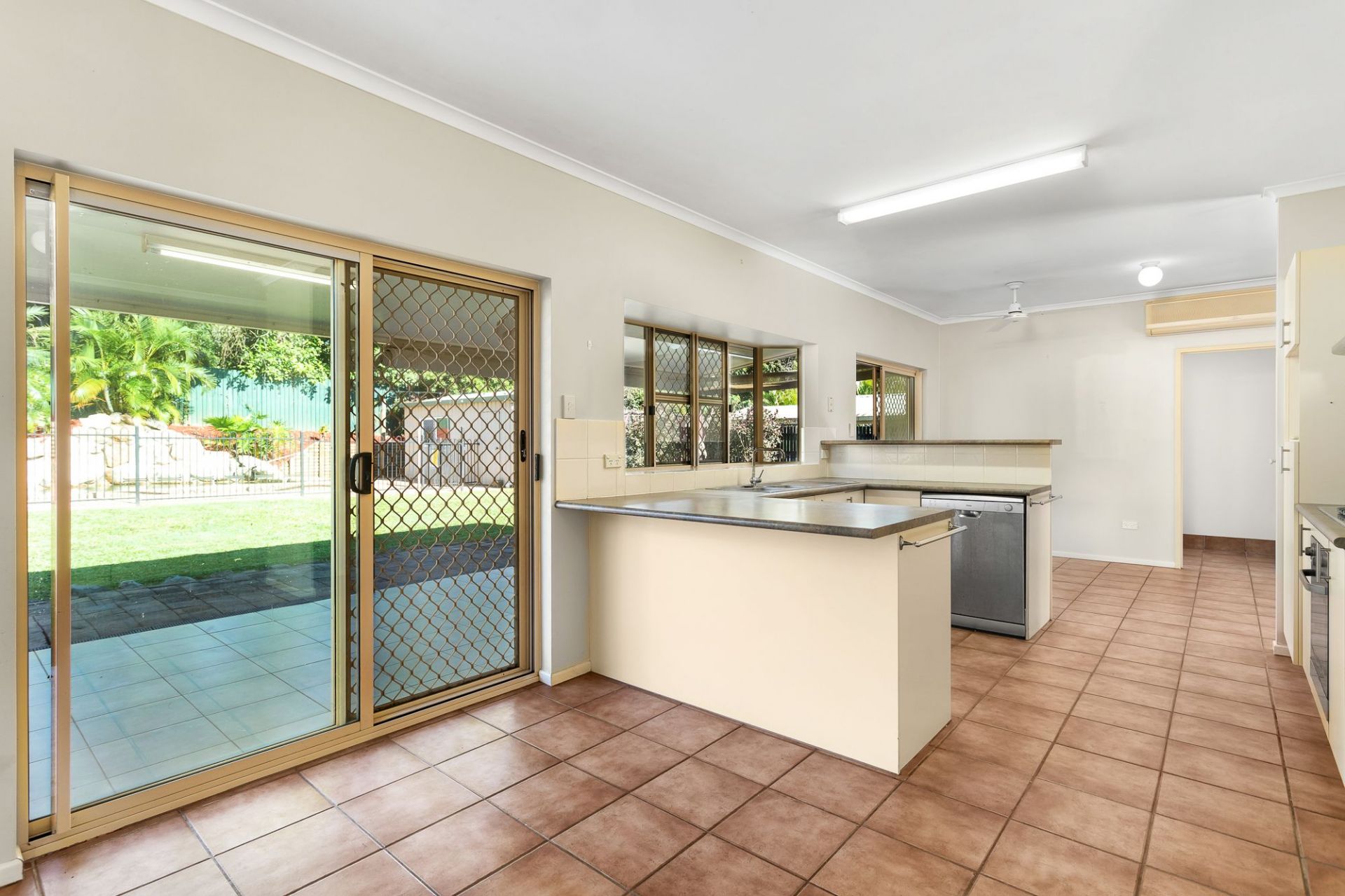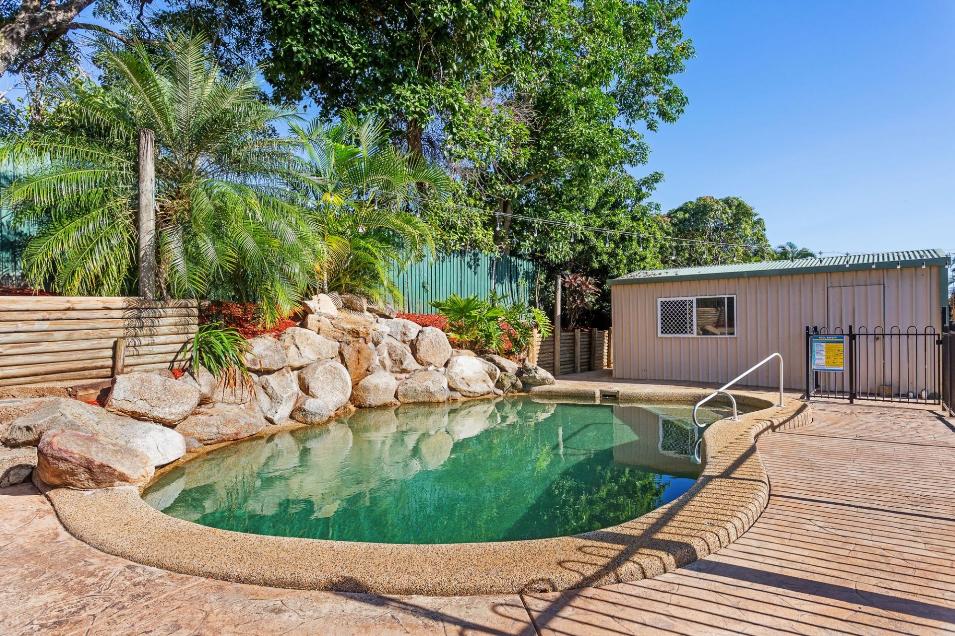 Kitchen servery window to large entertaining area that overlooks sparkling in ground pool with waterfall and easy care yard - great for busy Mum's able to watch kids from the kitchen.