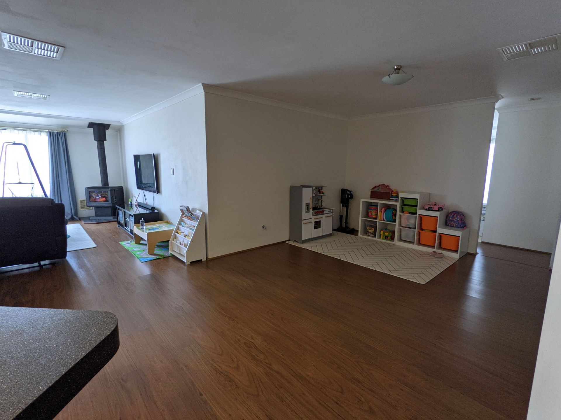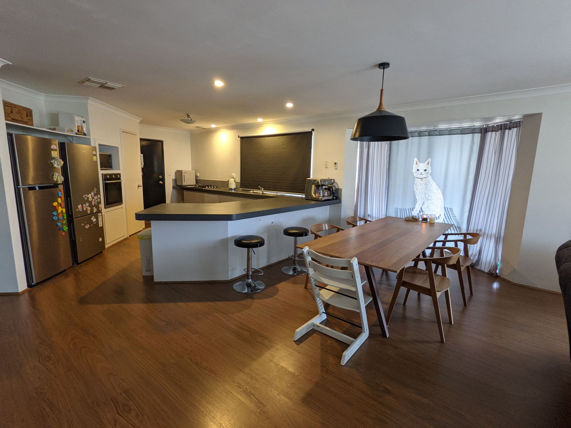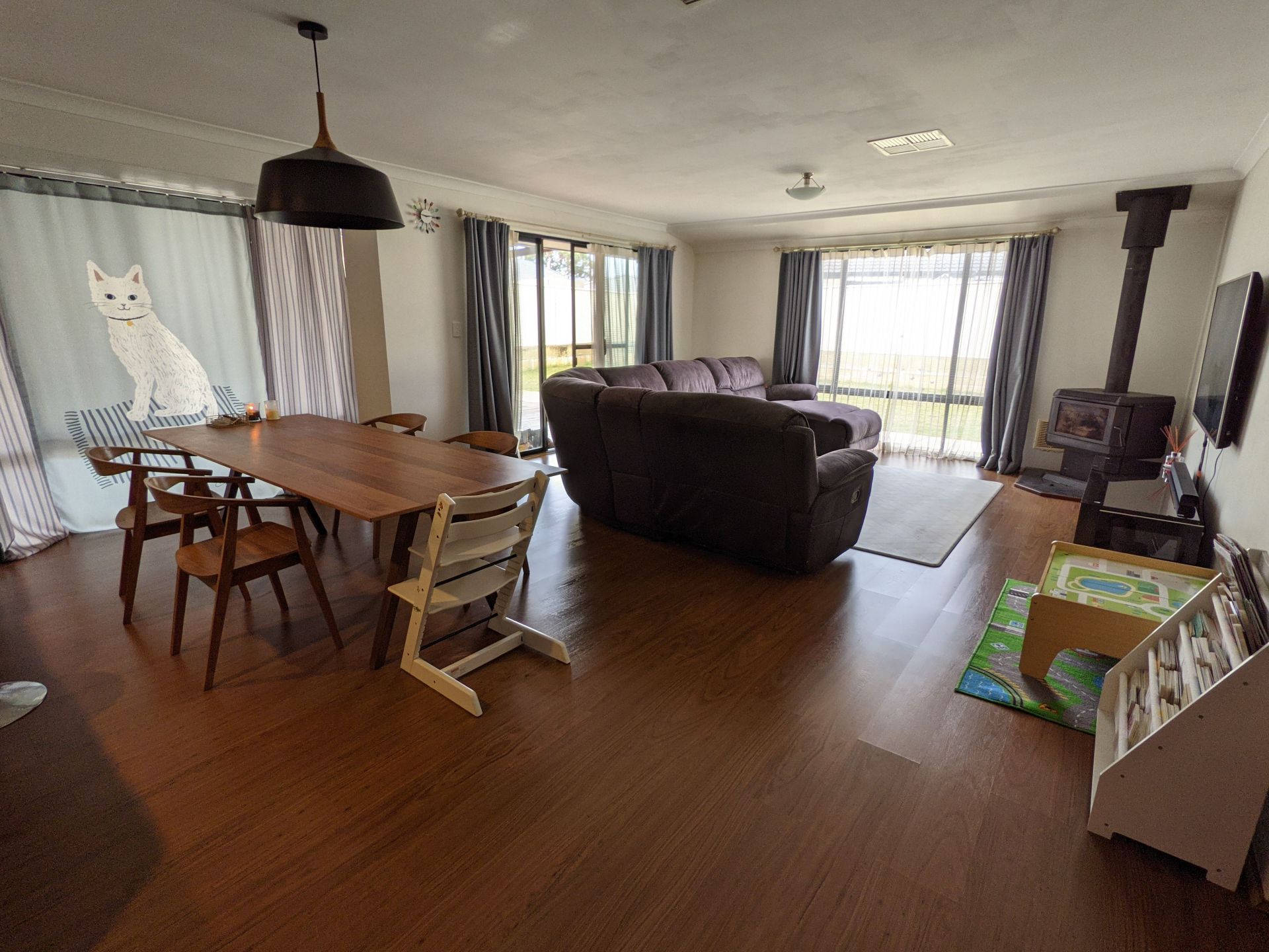 large open living spaces for dining, living and entertainment with updated timber laminate.