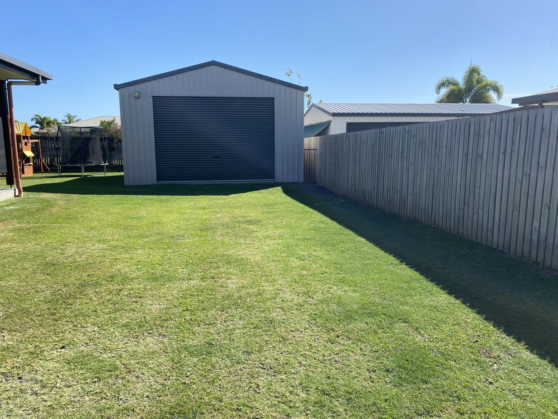 This huge backyard has ample space for the 6X9 shed with a bonus of a extra roller door on the side. The shed is high clearance and has lighting through out with multiple PowerPoints. Conveniently the shed is accessible through the large gated side access.
