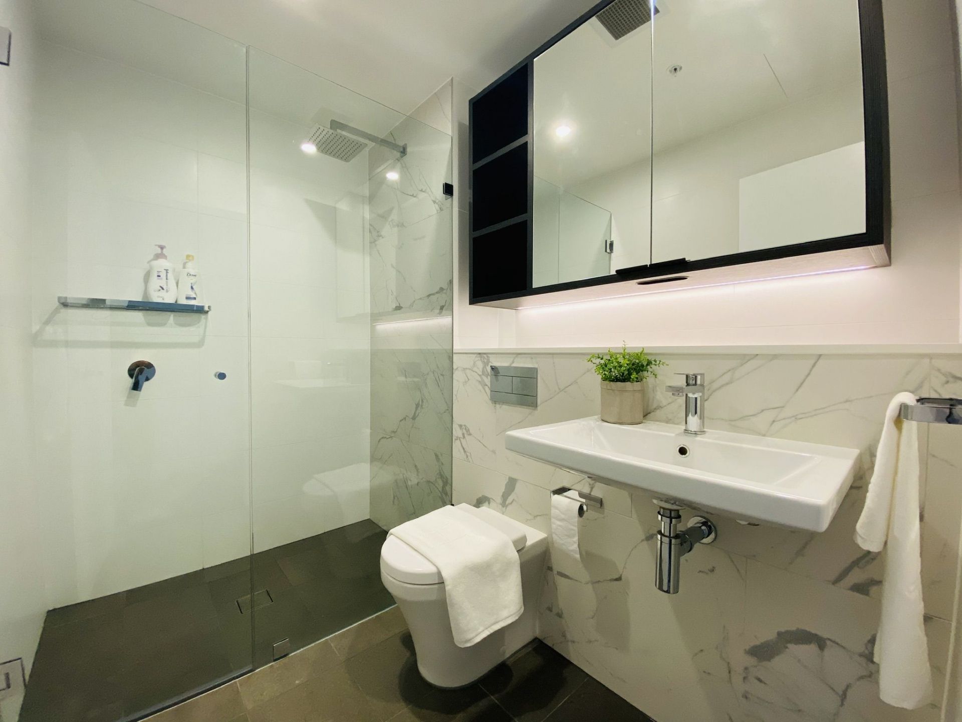 Sleek Bathroom and internal laundry with washing machine and drier.