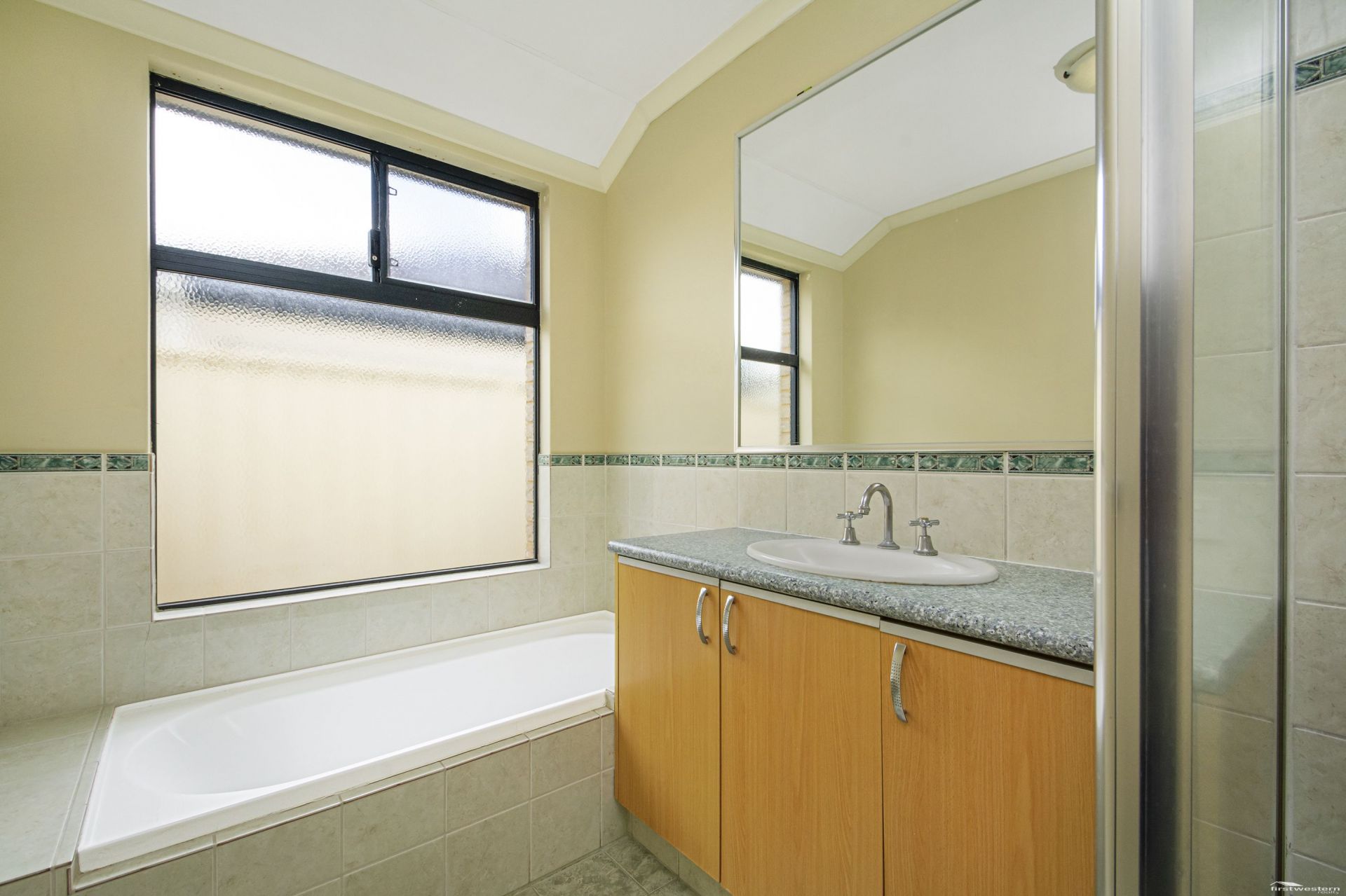 - Main Bathroom is fully tiled with bathtub, separate shower & vanity in neutral tones.