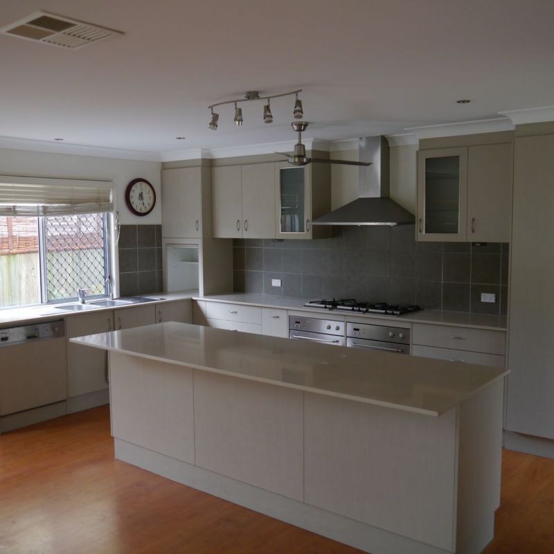 A large island bench incorporates a breakfast-bar and the fridge recess is plumbed in. You'll be hard-pressed to fill the cupboard space!