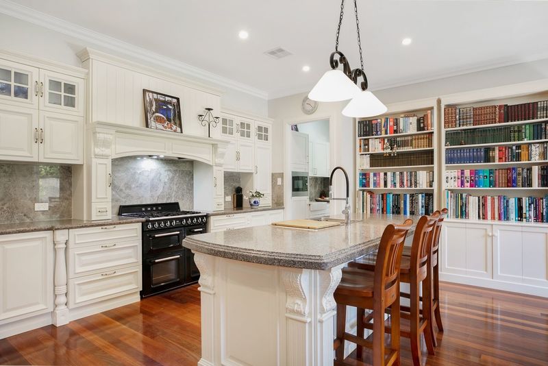 An elaborate stylish French provincial entertainer's kitchen, with butler's pantry features premium European appliances, including a Smeg Victoria triple oven stove with an integrated 6 burner gas cooktop, Miele dishwasher and granite benchtops. The kitchen is north facing, full of sunshine and leading to a formal dining, al-fresco, wrap around veranda with polished travertine floors, gardens and lawns. A sumptuous formal living room leads to the veranda, colonnade pergola with decorative grape vines, roses, and a pathway to a beautiful garden gazebo in a lower part of the garden.