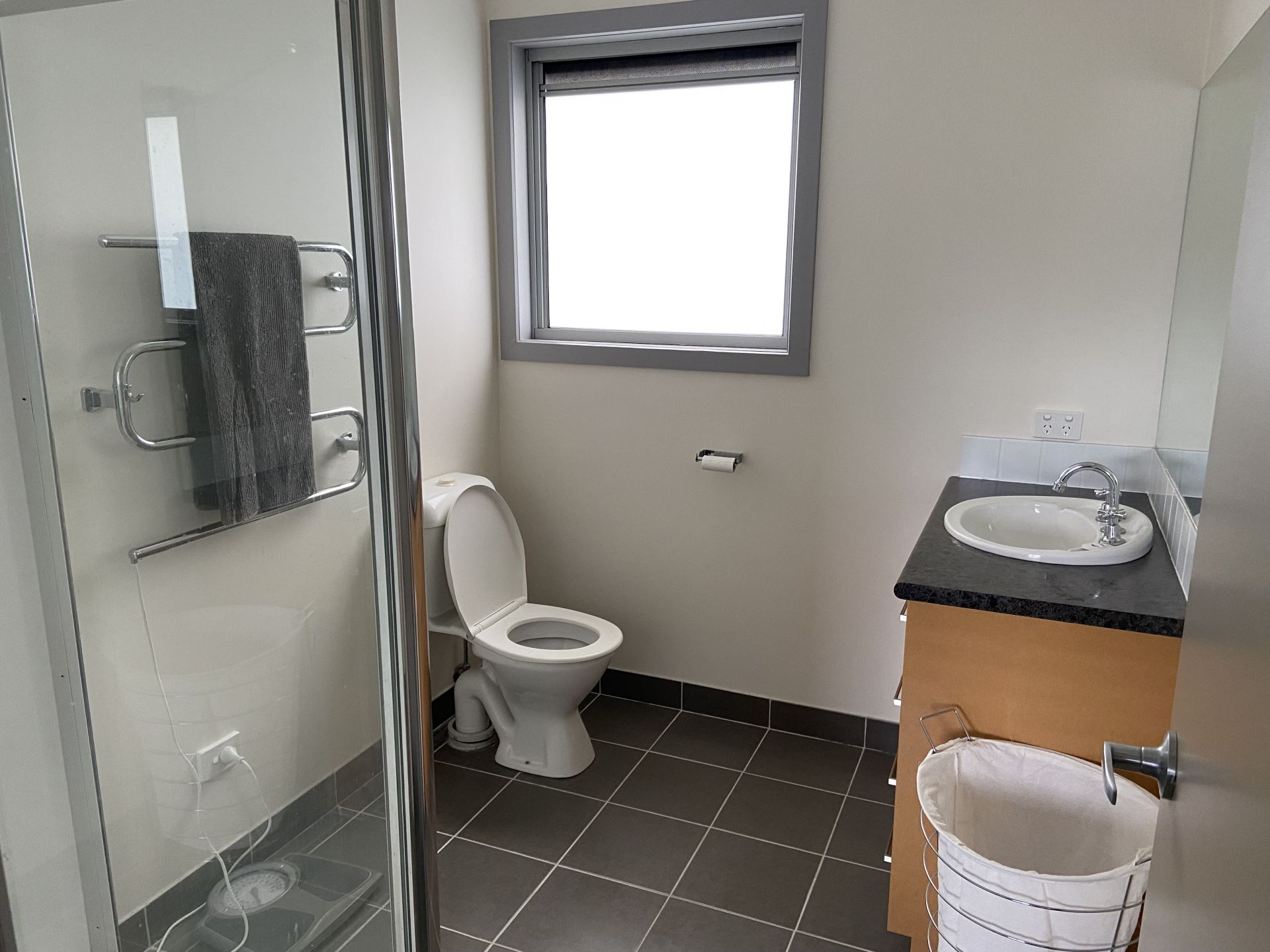 The master bedroom has a wall of built-in wardrobes and an ensuite with a shower, toilet and vanity.