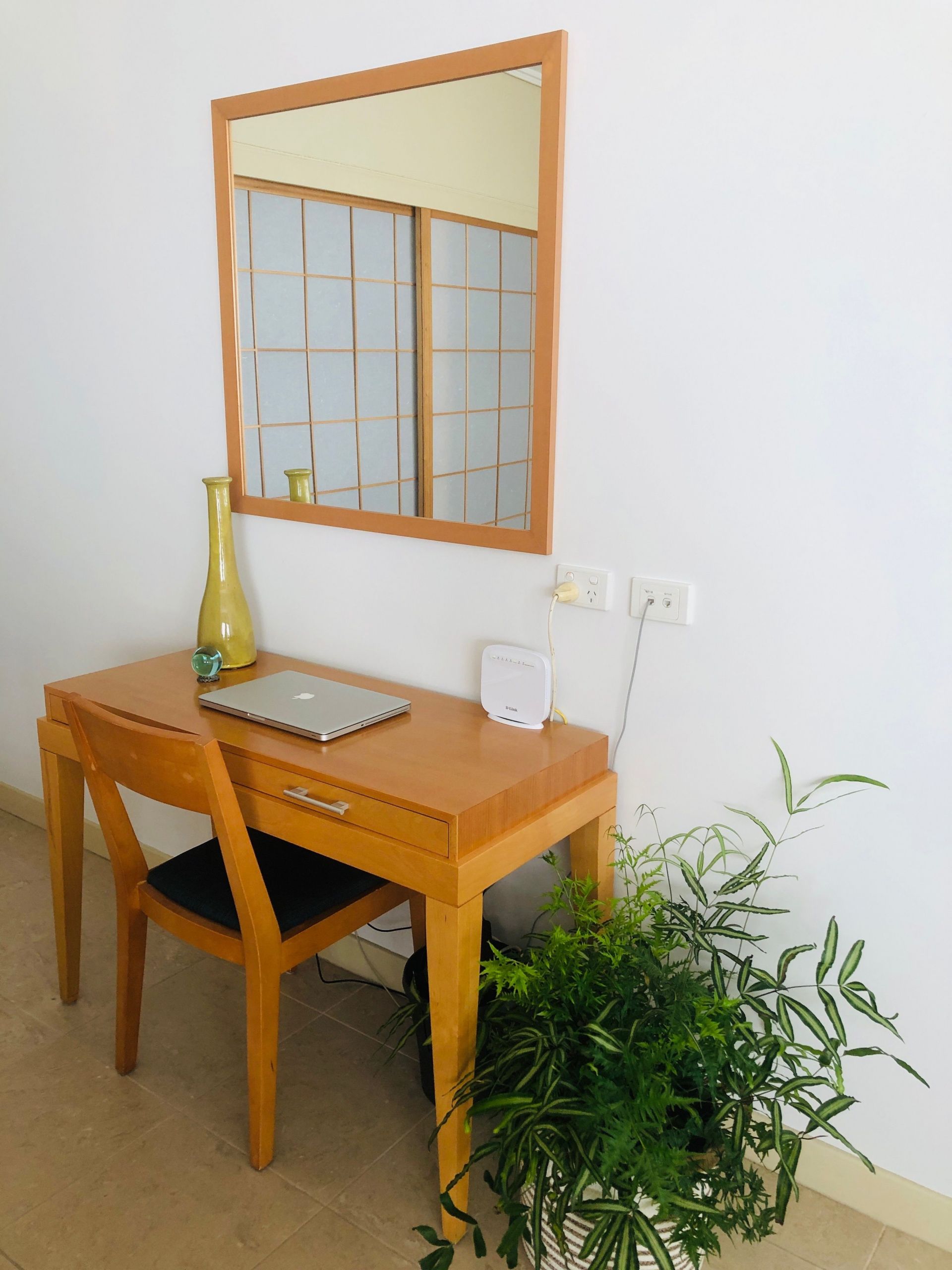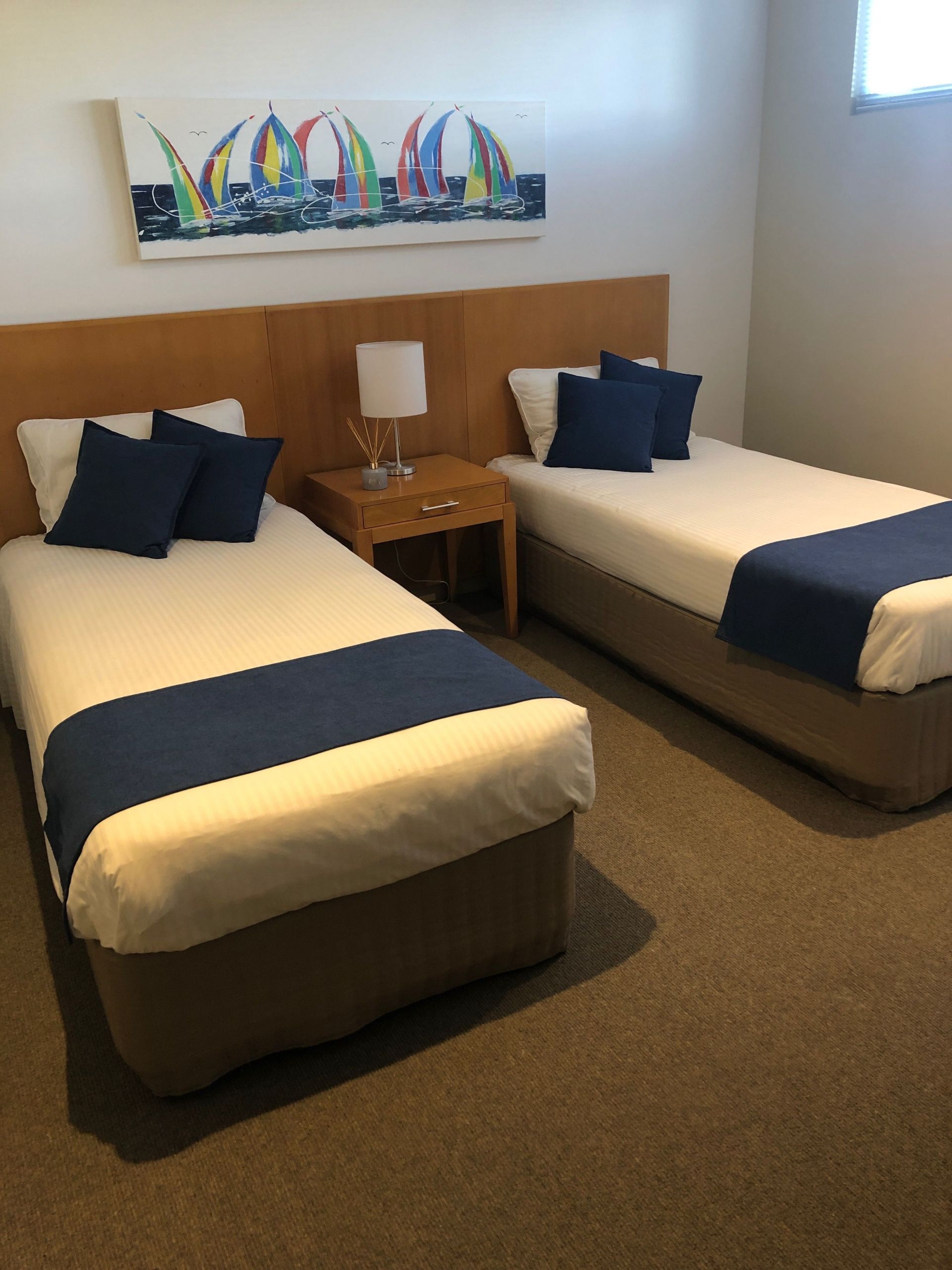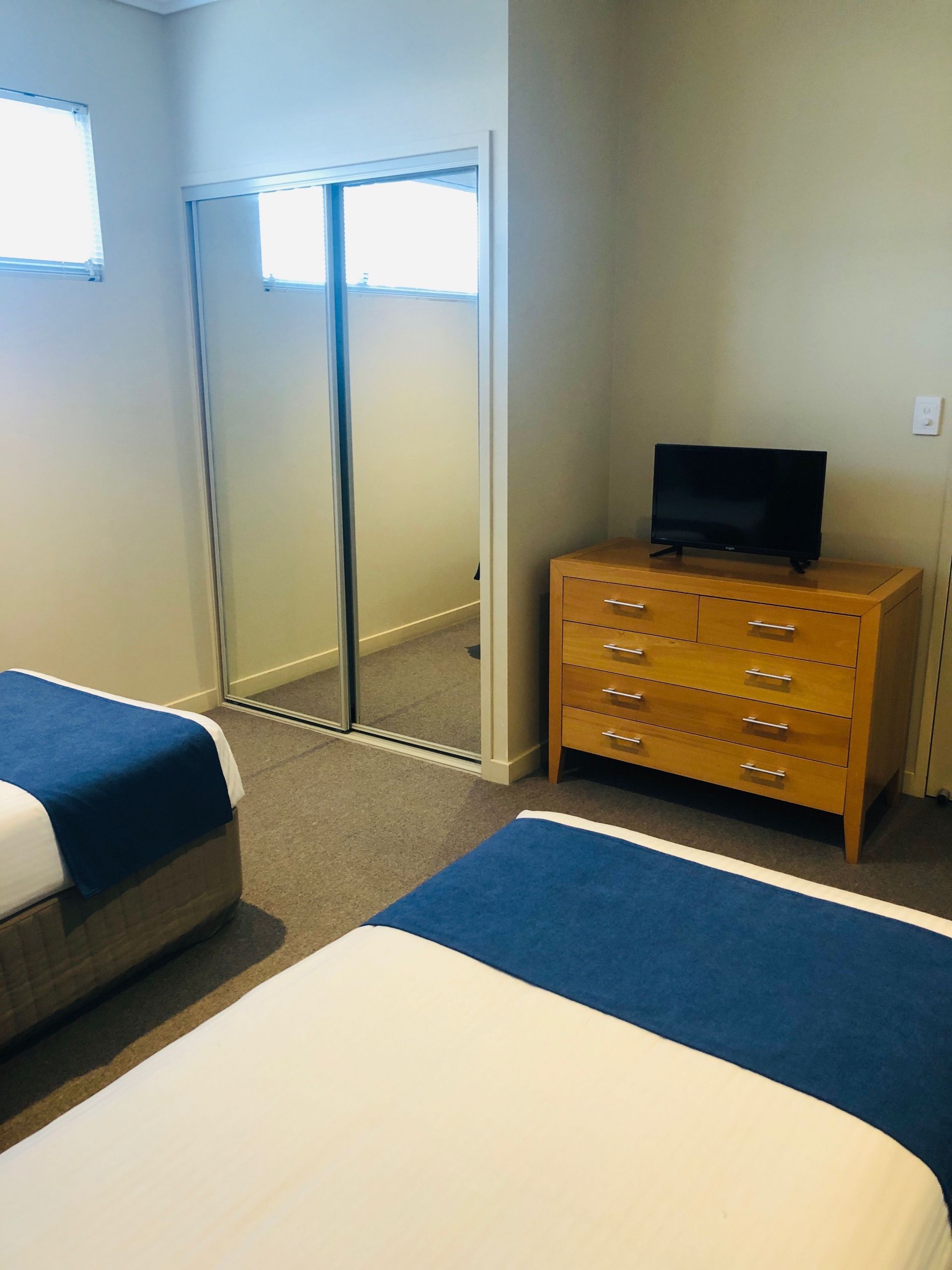 The second bedroom has two king single beds which can be linked together to make a king bed, also with built in wardrobe.