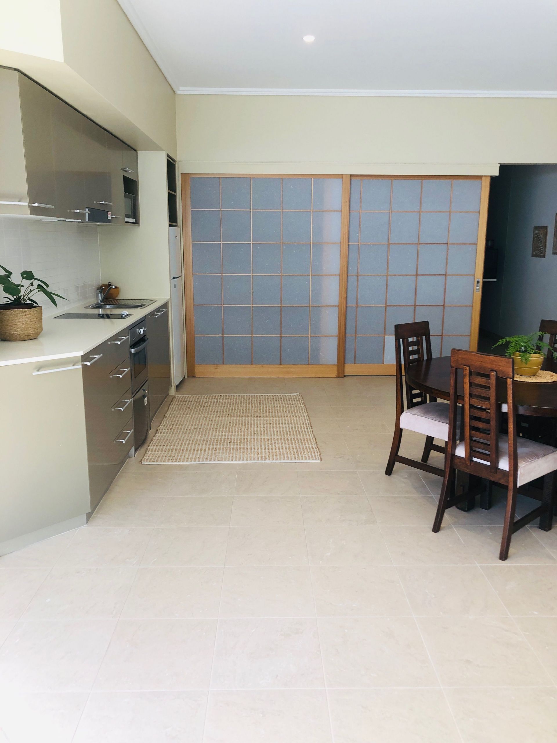Spacious open plan living and dining area with modern kitchen, high ceilings.