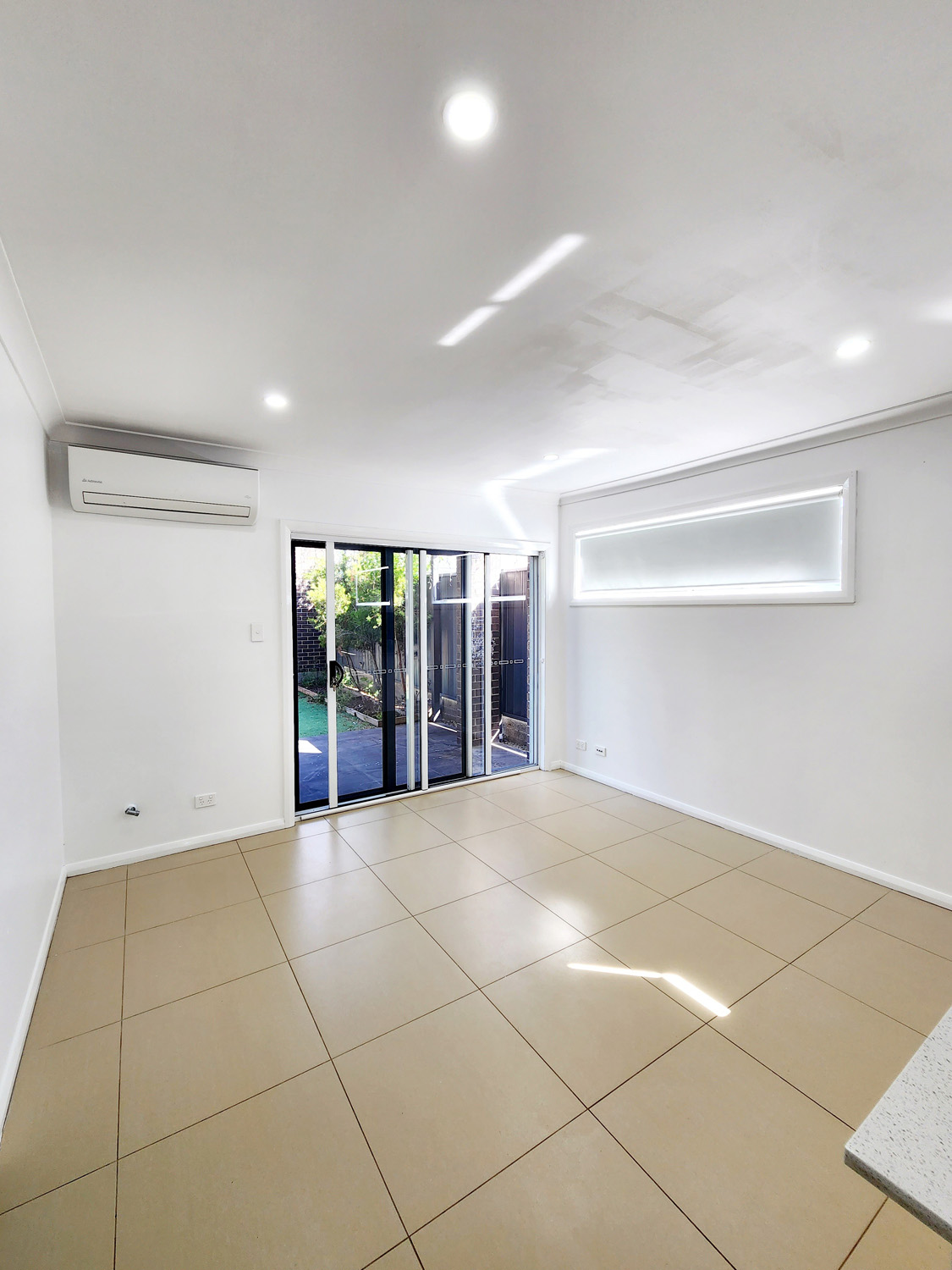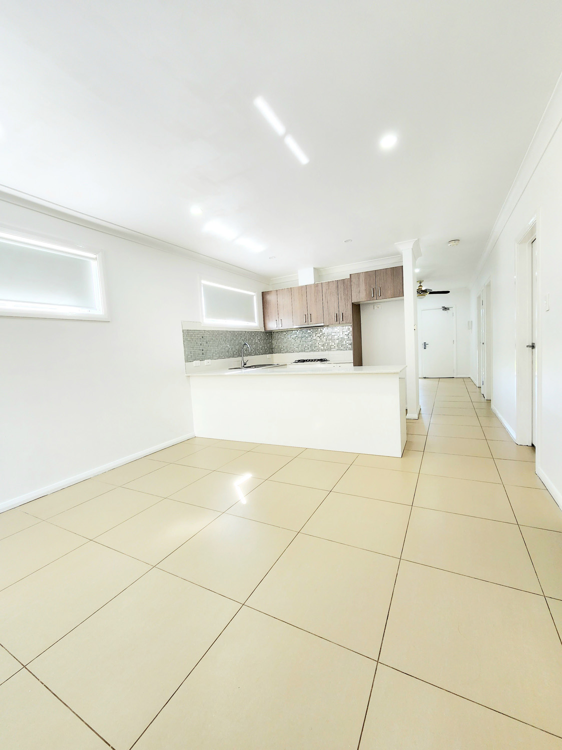 Tiled open plan layout living and kitchen, separated dining area with ceiling fan.